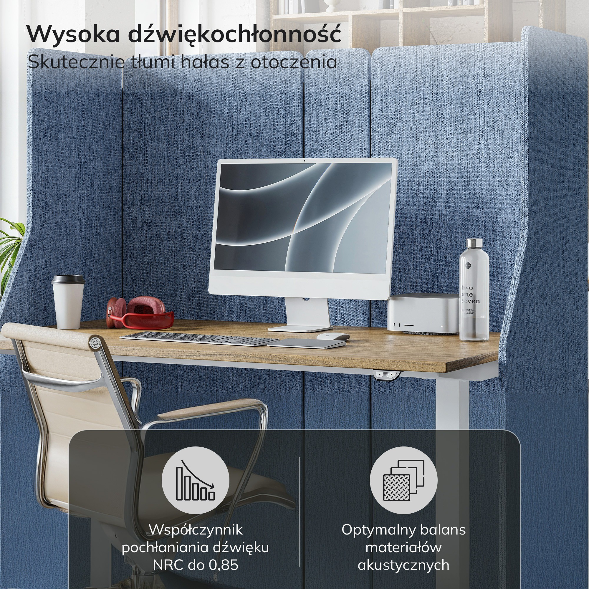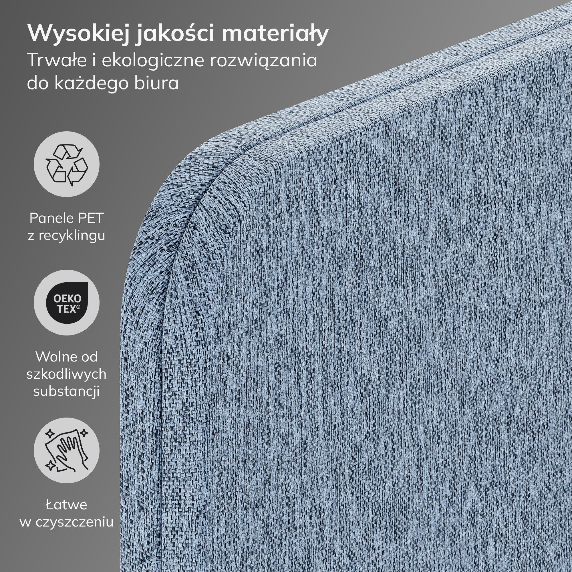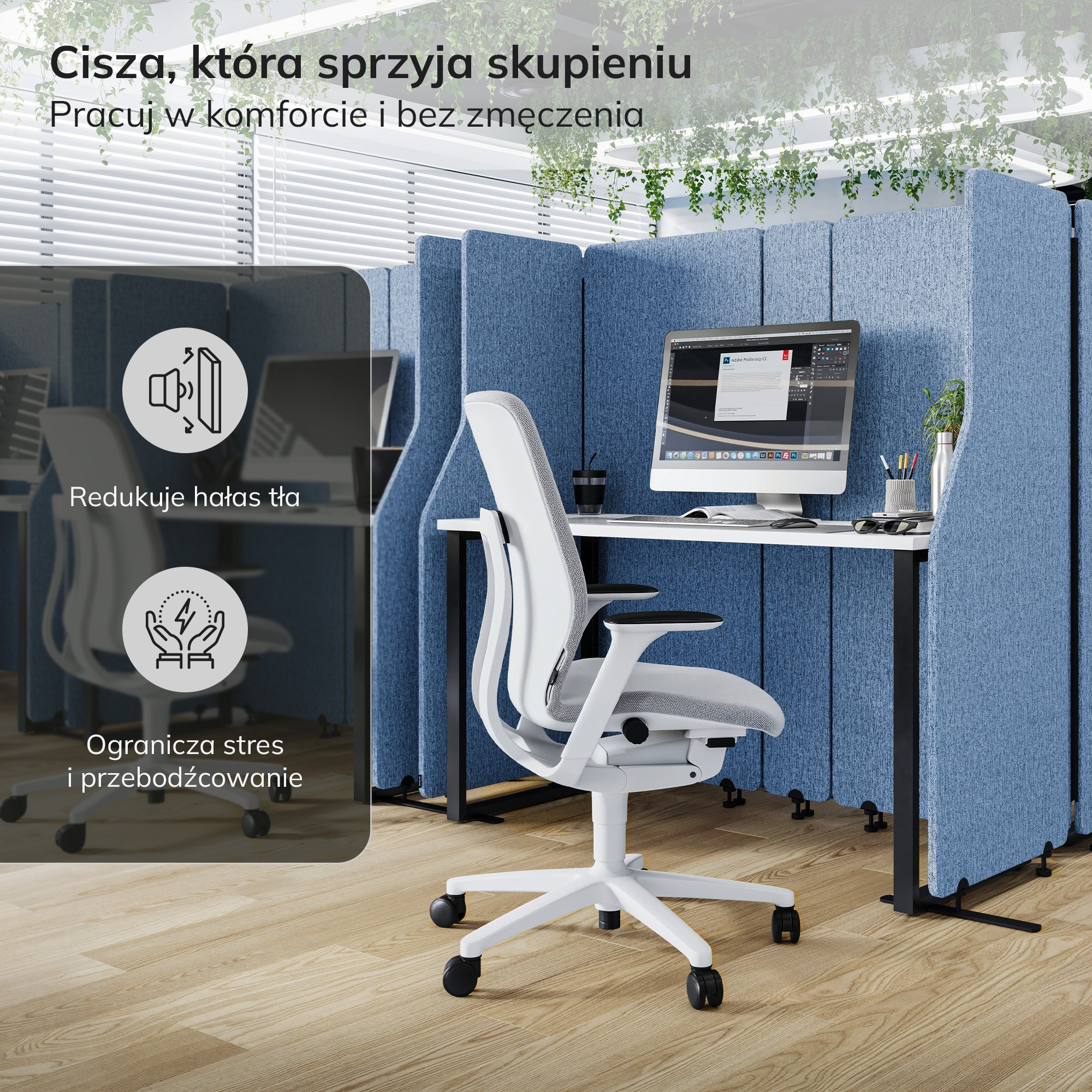 Akustická stena SADIE sa pýši moderným a elegantným dizajnom, ktorý sa hodí do každej kancelárie. Modrý odtieň Frozen Lake vnáša do interiéru vizuálny pokoj a harmóniu. Stena tak nielen tlmí hluk, ale tiež esteticky dopĺňa váš pracovný priestor.
