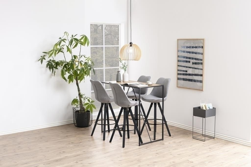 Barový stôl Seaford sa skvele hodí do minimalistických interiérov. Kostra nábytku je vyrobená z kovu lakovaného práškovou farbou, zatiaľ čo doska je z dosky s dyhou imitujúcou dub.Pod blatom sa nachádzajú dva pod uhlom usporiadané prvky, ktoré okrem dekoratívnej úlohy dodatočne stabilizujú základňu. Stôl sa hodí do kuchyne alebo jedálne, a tiež do verejných priestorov, ako sú bary či reštaurácie. Počet kartónov: 1 Rozmery kartónov: 121x62,5x7,5cm Hmotnosť kartónov: 14,2kg