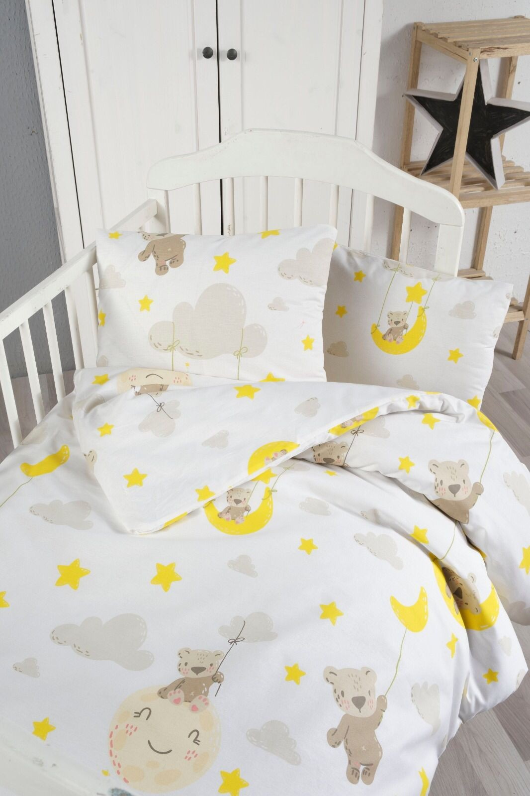 Bavlnené detské obliečky do malej postieľky 90x135, 45x60 cm medvedík v oblakoch nitkový gombík
