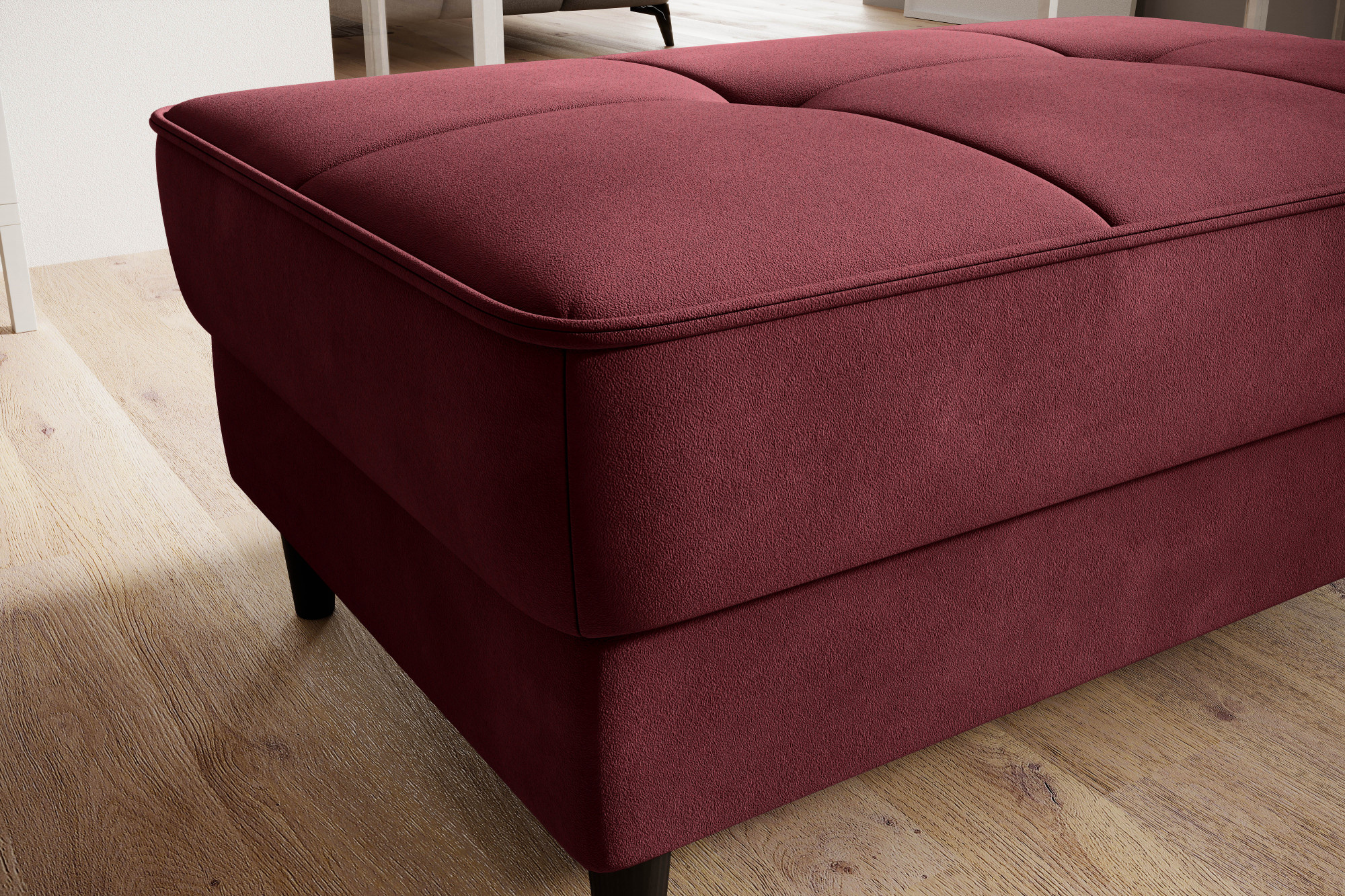 Model Bellis je naším vysoko kvalitným návrhom, ktorý zlepší usporiadanie vášho interiéru. Široké, pohodlné sedadlo tohto kusu nábytku vám umožní pohodlne odpočívať. Jeho minimalistická forma a jemné prešívanie fungujú výnimočne dobre s modernými interiérovými štýlmi. Interiér Bellis je vybavený špeciálnym mechanizmom, ktorý umožňuje jeho otvorenie. Bellis môže byť použitý ako ďalší priestor na ukladanie vecí. Puf je vyrobený iba z vysoko kvalitných materiálov: vysoko elastickej HR peny, peny T2130 a vlnitých pružín typu B. Tieto komponenty spoločne robia ponúkaný produkt veľmi pružným. Nohy taburetu sú vyrobené z masívneho dreva. Poskytujú mu dostatočne vysokú stabilitu a robia jeho ľahký tvar príjemným pre oko.