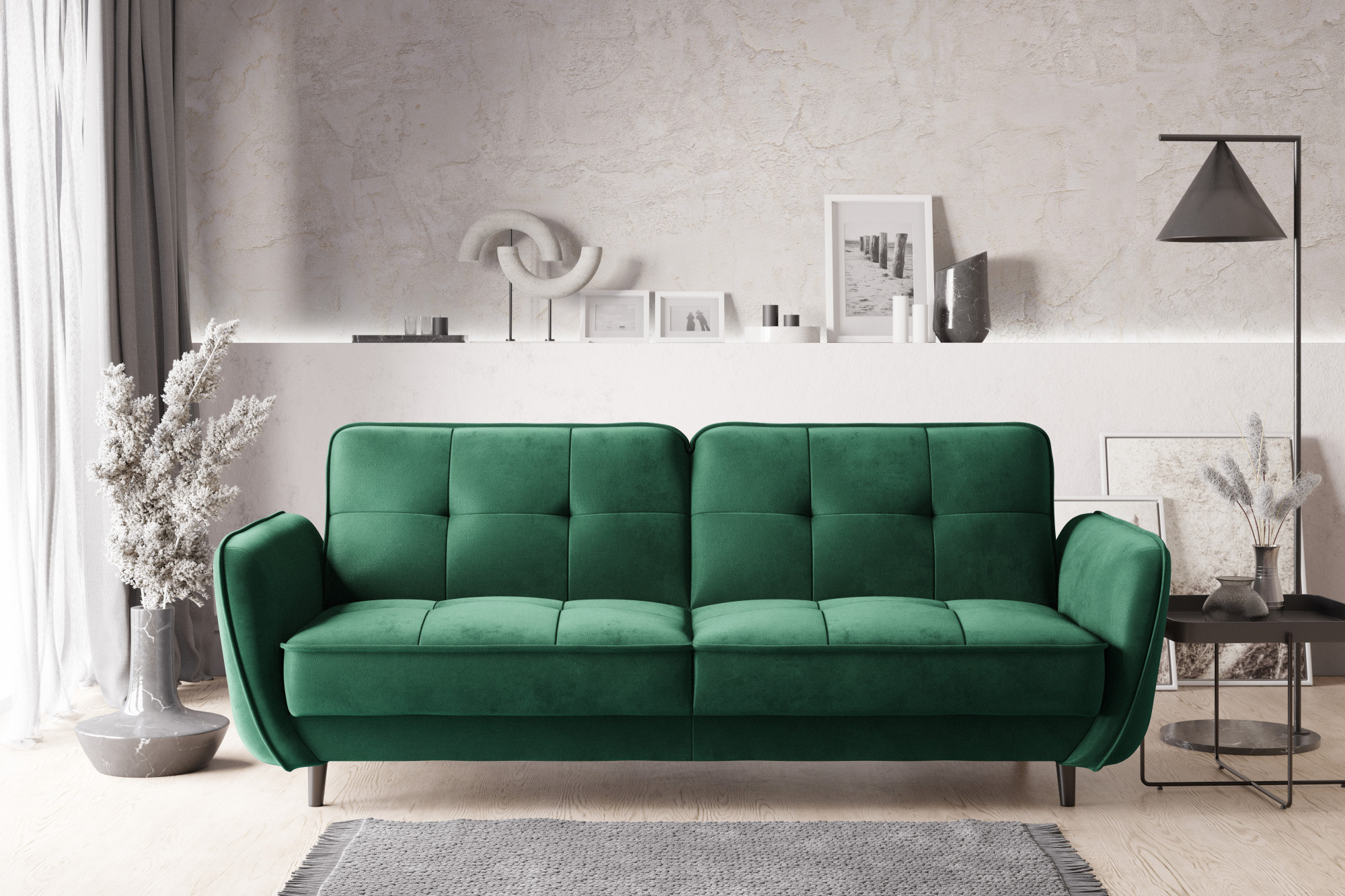 Pohovka Bellis kombinuje klasickú eleganciu s moderným štýlom. Pohovka Bellis s funkciou spania je doplnená elegantnými drevenými nohami, ktoré prinášajú do každej miestnosti nádych prírody. Šírka pohovky 220 centimetrov je vhodná pre stredne veľkú obývačku, zatiaľ čo 11 centimetrov vysoké nohy vizuálne zväčšujú menšiu miestnosť a umožňujú upratovanie pod nábytkom. Bellis je tiež dodávaný s úložným priestorom na posteľnú bielizeň - užitočné, ak nie je miesto na ďalšie deky alebo vankúše. Pohovka Bellis má tiež funkciu spania. Vďaka mechanizmu skladania click-clack môžete rýchlo a jednoducho premeniť pohovku na pohodlnú posteľ. Navyše nie je potrebné pohovku Bellis odsúvať od steny, keď je rozložená a aktivovaná funkcia spania. Bellis ponúka ležiacu plochu s rozmermi 190x110 centimetrov. Kus nábytku je vyplnený vysoko flexibilnou HR penou, ktorá je známa svojou pevnosťou a odolnosťou. Sedák pohovky aj operadlo sú vybavené týmto typom peny. Rozkladacia pohovka Bellis je tiež vybavená vysoko kvalitným jadrom s pružinami typu B a vreckovými pružinami. Ozdoby vo forme prešívania a quiltovania sú zodpovedné za estetickú stránku pohovky.
