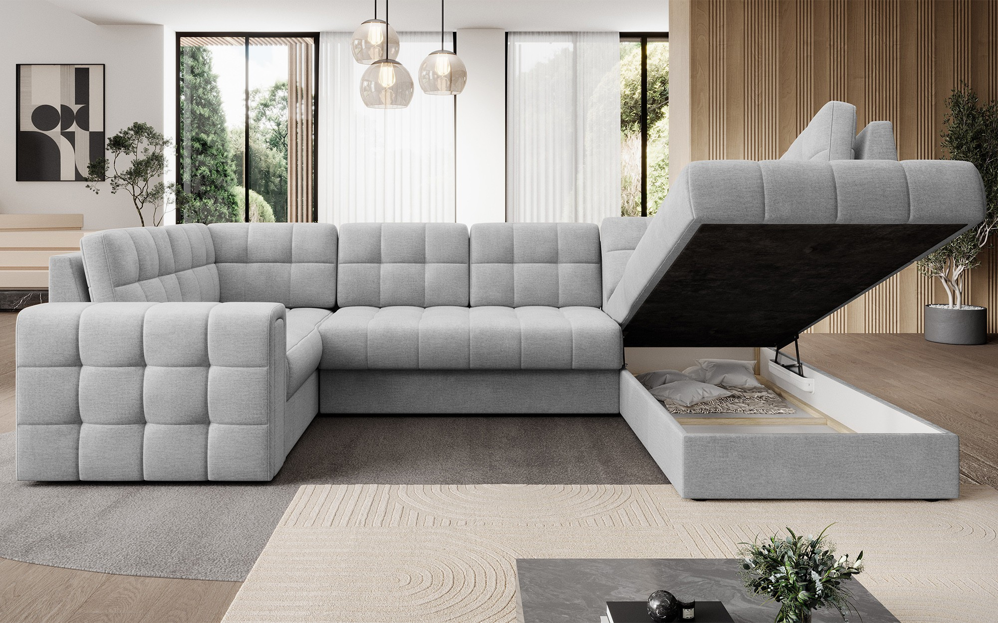 Moderná rohová rozkladacia pohovka Blewett 299x198x82 cm je ideálnou voľbou pre tých, ktorí hľadajú elegantnú a pohodlnú rohovú pohovku do svojej obývačky.Rohová pohovka Blewett vyniká pohodlným sedákom vyrobeným z vlnových pružín typu B a polyuretánových pien T2540 a T2130, čo zaisťuje dlhodobé pohodlie a odolnosť.Operadlo je vyplnené penovou výplňou, ktorá sa dokonale prispôsobí tvaru chrbta, čím zvyšuje komfort relaxácie.Rohová sedacia súprava Blewett v obývacej izbe je vybavená spaciou funkciou typu Dolphin, ktorá umožňuje rýchle rozloženie, a praktickým úložným priestorom na lôžkoviny—ideálna na skladovanie.Táto moderná rohová pohovka Blewett má čalúnené operadlo, vďaka čomu vyzerá skvele v akejkoľvek časti miestnosti.Robustné čierne plastové nohy zdôrazňujú moderný štýl pohovky.Vysoko kvalitné remeselné spracovanie, funkčnosť a módny dizajn robia z Blewettu vynikajúcu rozkladaciu pohovku, ktorá spĺňa očakávania aj tých najnáročnejších používateľov.