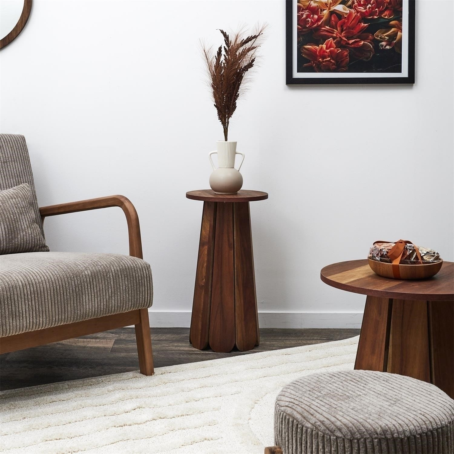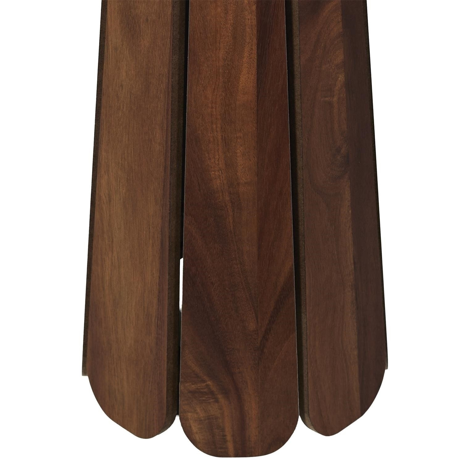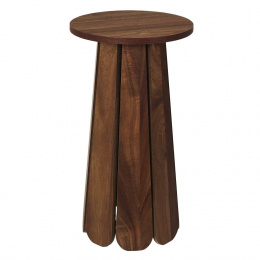 Bočný stolík Will je vyrobený z MDF dosky s dyhou vo farbe orechového dreva. Stolík s okrúhlou doskou je vybavený jedinou nohou, ktorá sa skladá z 8 dokonale profilovaných doštičiek. Stolík vyžaduje montáž. Max. zaťaženie stolíka 15 kg