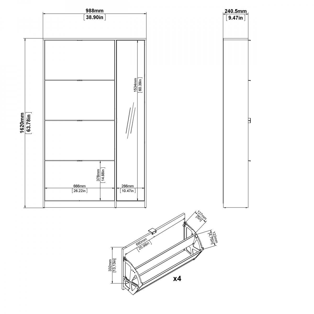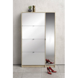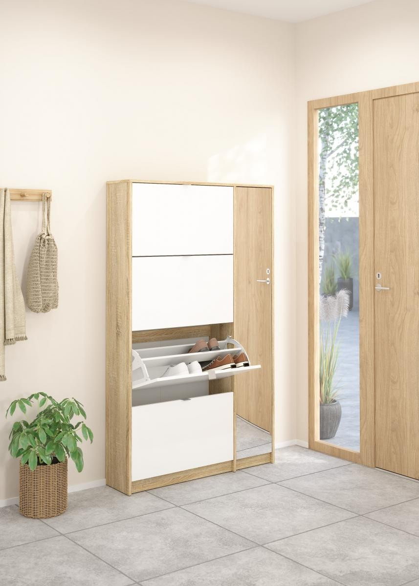 Po priestrannom botníku túži každý milovník topánok aj početná rodina. Topánky sa hromadia v predsieni, vzniká chaos a zakopávanie o topánky je na dennom poriadku. Zachráňte svoju predsieň pred neporiadkom a zaobstarajte si tento úžasný botník s výklopnými dvierkami a skrinkou so zrkadlom. Vďaka svojmu prevedeniu pojme botník Flap naozaj veľké množstvo topánok. Do každej výklopnej priehradky môžete ukladať topánky a skrinka poslúži napr. na ukladanie prípravkov na čistenie a údržbu topánok, alebo na odloženie drobných vrchných odevov ako sú čiapky, rukavice atď...Botník je vyrobený z lamina, ktoré je odolné a ľahké na údržbu. Botník je dodávaný v demonte. Súčasťou balenia je montážny návod vrátane všetkých spojovacích prvkov. Zobrazené doplnky a dekorácie nie sú v cene.