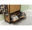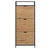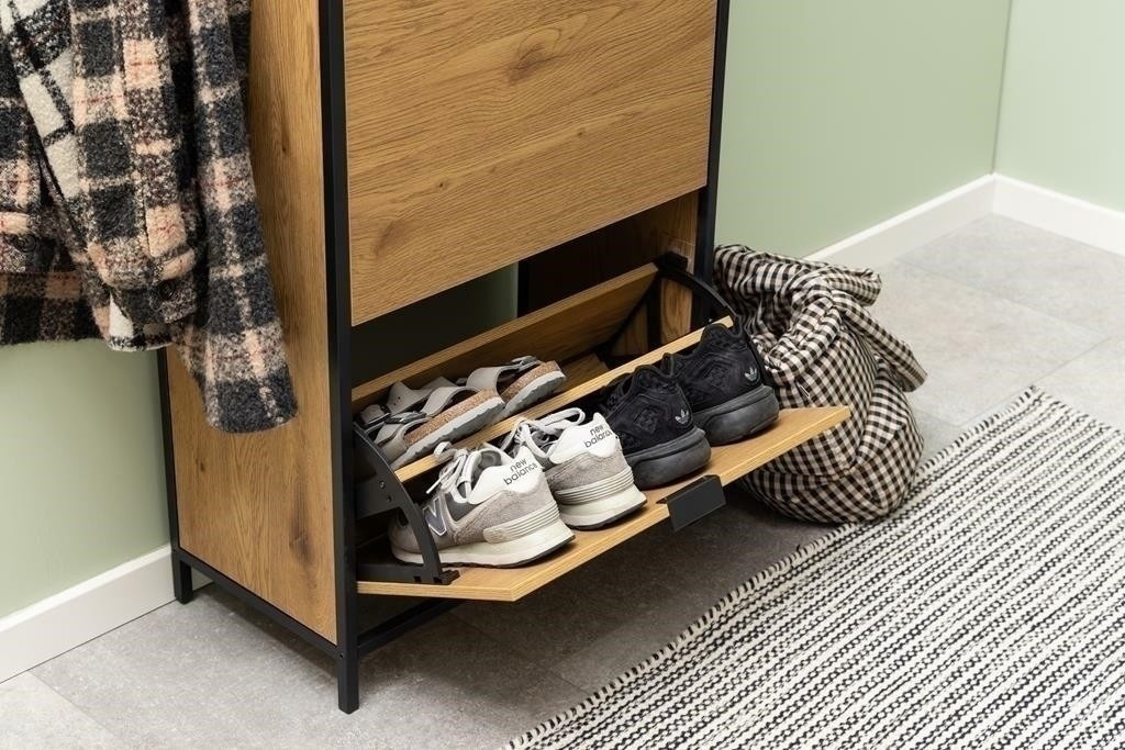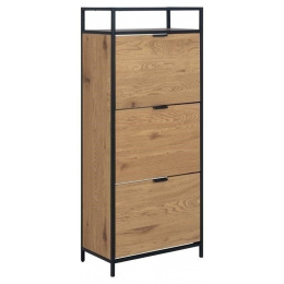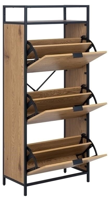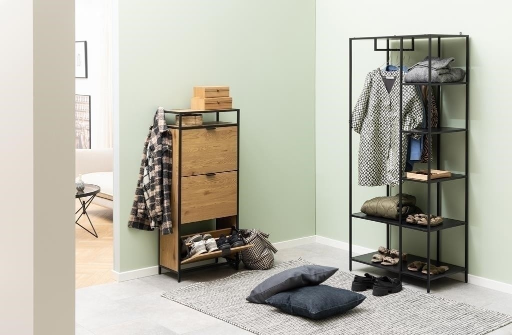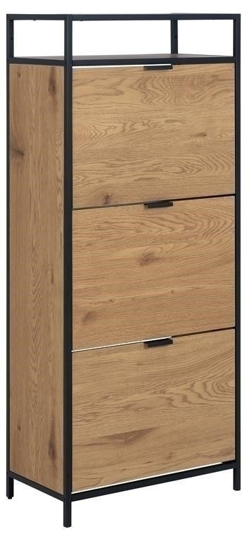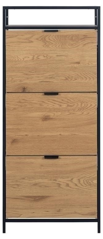 Skrinka na topánky Seaford ti pomôže usporiadať predsieň a zabezpečí, že tvoja obuv bude mať svoje miesto. Ukladajte svoje topánky v dvoch radoch, ktoré sa zmestia do každej zásuvky - a vďaka trom zásuvkám budete mať veľa miesta. Dyha imitujúca divoký dub v kombinácii s čiernym kovovým rámom bude moderným doplnkom každého domu. Hlavné vlastnosti: Moderný botník s tromi zásuvkami Každá zásuvka pojme dva rady topánok Surový vzhľad divokého duba Kovový rám a základňa s čiernym práškovým nástrekom a police z MDF Dánsky dizajn chránený vy