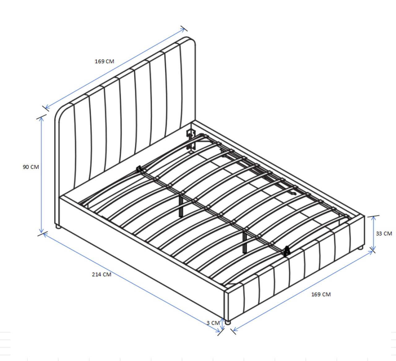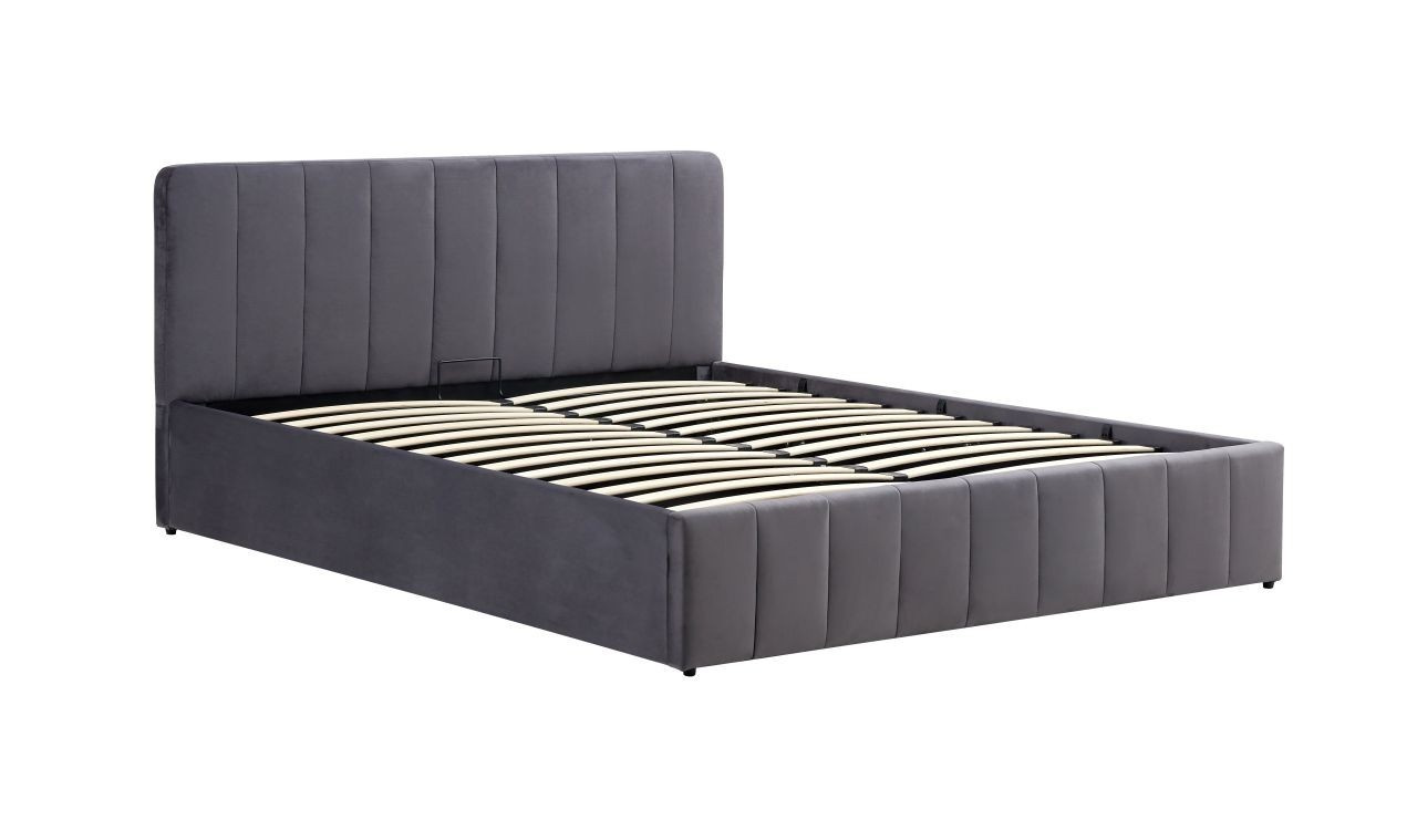 Rozmery: - celková dĺžka: 214 cm - celková šírka: 169 cm - výška (bez matraca): 33 cm - výška čela: 90 cm - plocha na spanie: 160x200 cm Materiál: - látka: zamat - rám: kov lakovaný práškovou farbou - lamely: pružné z preglejky Ostatné: - rošt v sade - úložný priestor na posteľnú bielizeň (otvárateľný z prednej časti postele pomocou plynových piestov) - počet lamiel: 16 ks v dvoch radoch - posteľ predávaná bez matraca Farba: - sivá