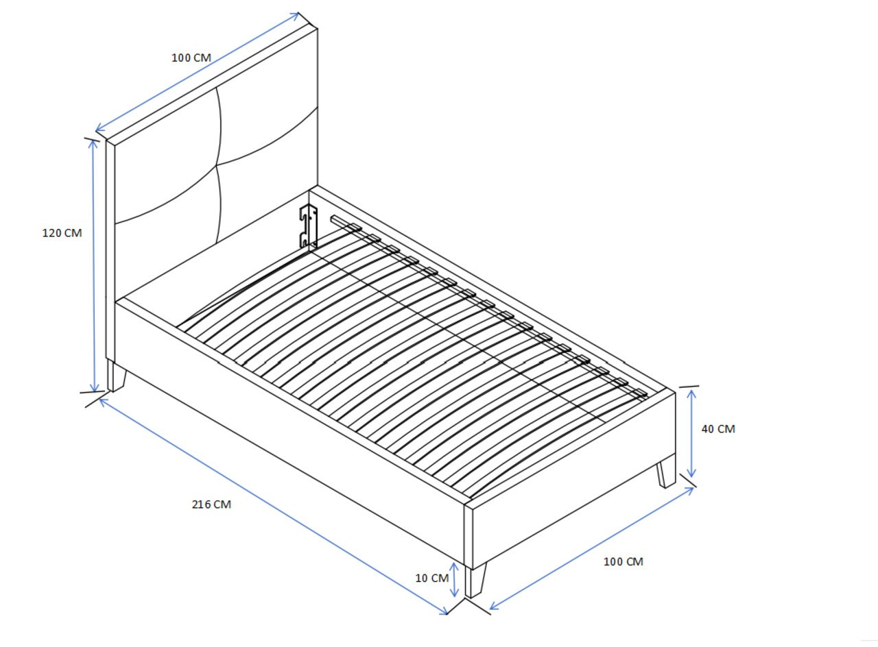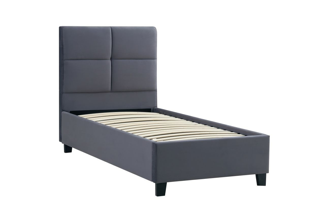 Rozmery: - celková dĺžka: 216 cm - celková šírka: 100 cm - výška (bez matraca): 40 cm - výška čela: 120 cm - plocha na spanie: 90x200 cm Materiál: - látka: zamat - rám: kov lakovaný práškovou farbou - lamely: pružné z preglejky Ostatné: - rošt v sade - počet lamiel: 18 ks - posteľ predávaná bez matraca Farba: - sivá