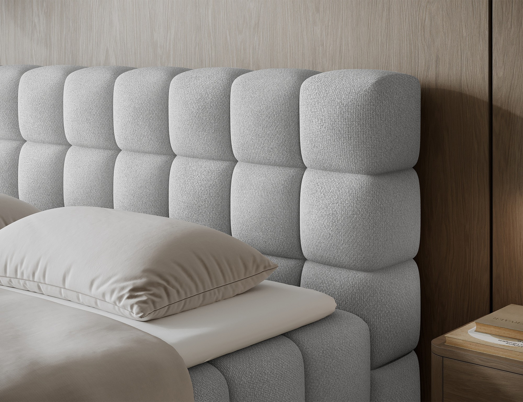 Posteľ SABENO je čalúnená v jemnej poťahovej látke, ktorá dodáva vašej spálni nádych luxusu a útulnosti. Kostra postele je vyrobená z pevného dreva, čo zaisťuje stabilitu a dlhú životnosť.