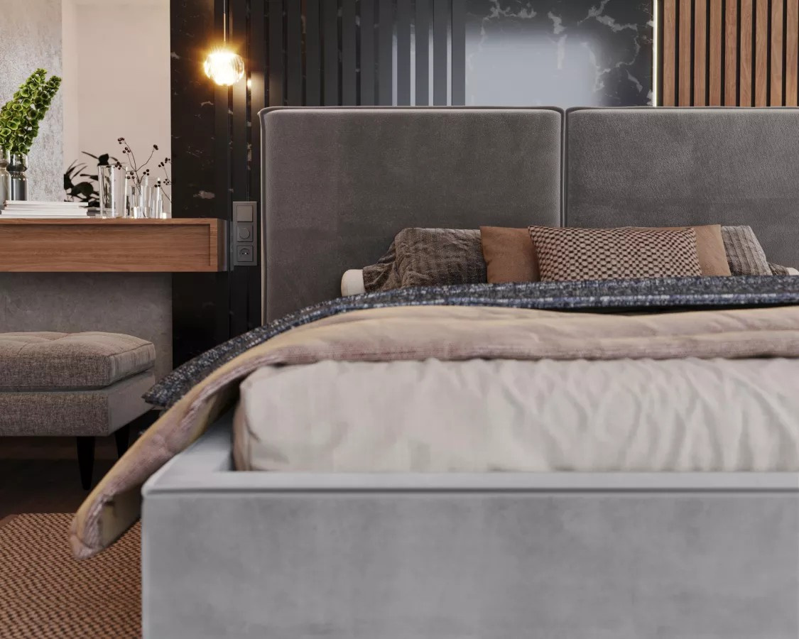 Čalúnená posteľ DOVER Pohodlná a prispôsobená posteľ je zárukou dobre strávenej noci. Ovplyvní to nielen kvalitu spánku, ale aj estetiku spálne a vnímanie miestnosti. Hľadáte originálne riešenie, stojí za to venovať pozornosť čalúnenej posteli DOVER. Model zaujme zaujímavým dizajnom a funkčnými riešeniami.Čalúnená posteľ DOVER sa dokonale hodí do najnovších trendov – skvele sa uplatní v spálňach zariadených v modernom alebo minimalistickom štýle. Pozornosť priťahuje predovšetkým široké čelo postele, ktoré dokonale prilieha k stene a dodáva interiéru neotrelý charakter. Jeho každodenné používanie významne ovplyvní vašu pohodu a spôsobí, že každý deň začne perfektne. Ploché čelo postele DOVER má klasický tvar a jeho minimalizmus narúša viditeľné, módne prešívanie.