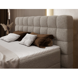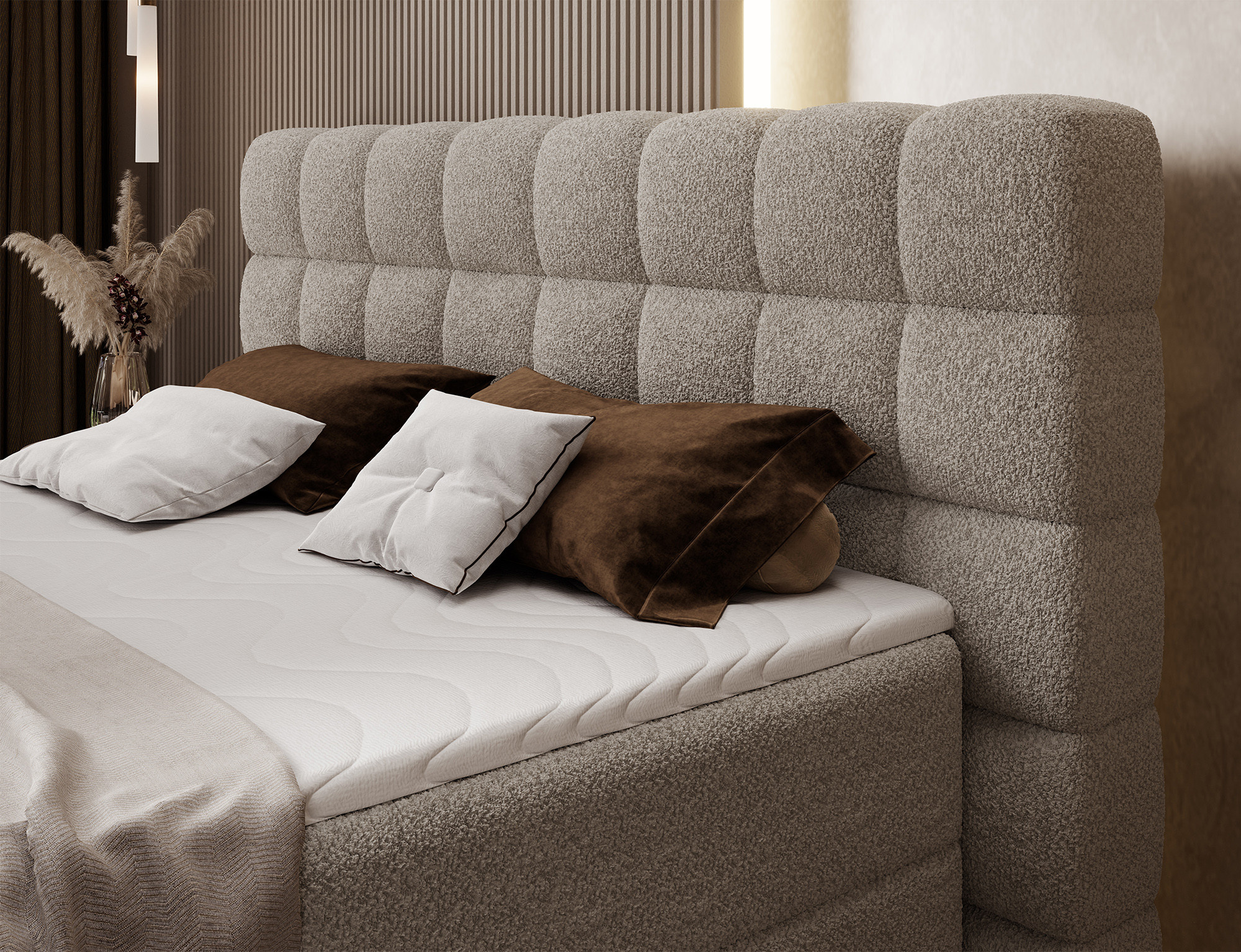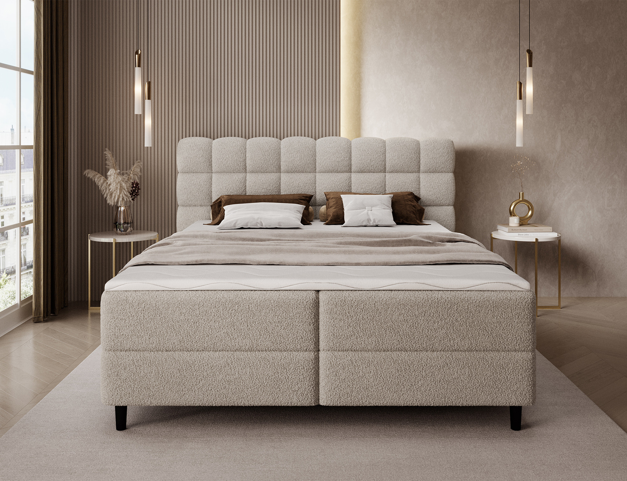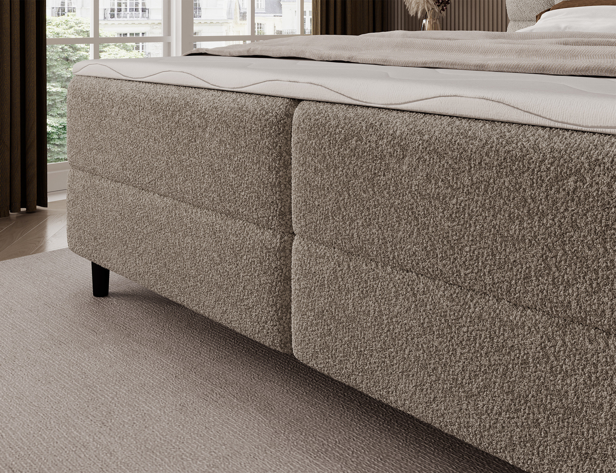Kontinentálna posteľ Camma kombinuje moderný dizajn, funkčnosť a vynikajúci spací komfort, čo z nej robí ideálnu voľbu pre elegantnú a praktickú spálňu; je dostupná v troch veľkostiach – 140x200 cm, 160x200 cm a 180x200 cm – a dokonale sa prispôsobí ako priestoru, tak individuálnym potrebám, zatiaľ čo jej pevná konštrukcia s celkovou výškou 102 cm a výškou sedu 56 cm zaisťuje každodenné pohodlie; posteľ má hĺbku 222 cm a šírka závisí od zvoleného modelu – 162 cm, 182 cm alebo 202 cm – čo jej dodáva stabilný a impozantný vzhľad, ktorý pridáva luxusný nádych každému interiéru; čalúnená vysoko kvalitnou látkou s jemným dotykom a štýlovo prešívaným čelom, kombinuje modernú eleganciu s pohodlnou oporou pre čítanie alebo relaxáciu; praktický úložný box poskytuje priestor pre posteľnú bielizeň a pomáha udržiavať spálňu upratanú, čo robí posteľ Camma nielen pohodlnou, ale aj vysoko funkčnou; dizajn je doplnený 10 cm čiernymi drevenými nohami, ktoré pridávajú vizuálnu ľahkosť a uľahčujú upratovanie pod posteľou; model Camma je ideálnou voľbou pre tých, ktorí si cenia moderný štýl, eleganciu, odolnosť a pohodlie, zaisťujúce zdravý a pokojný spánok každú noc.