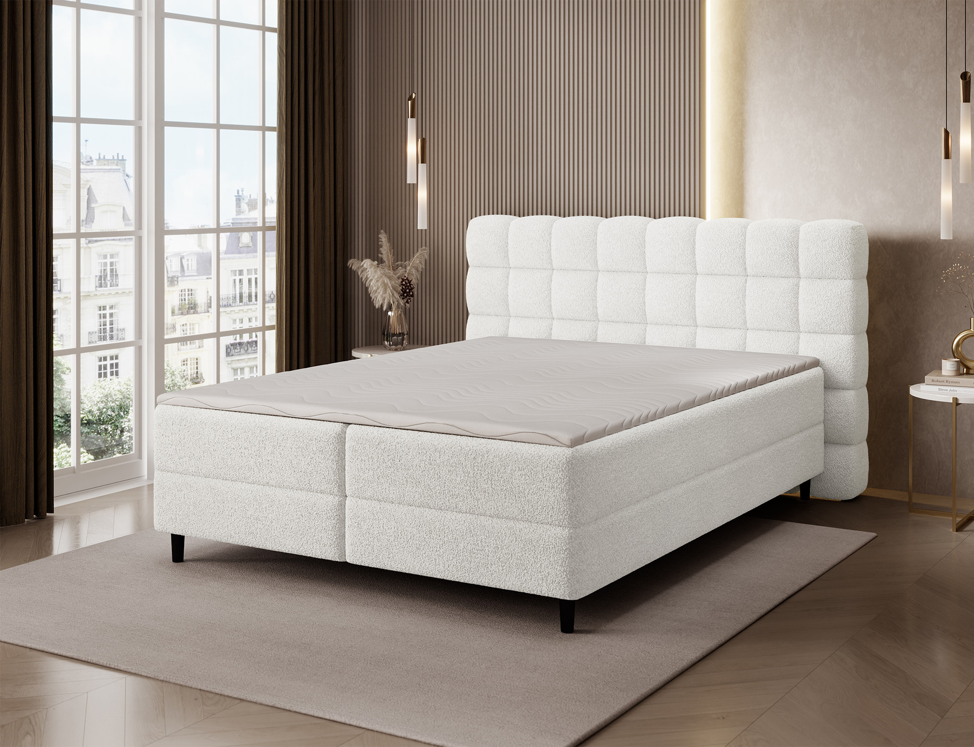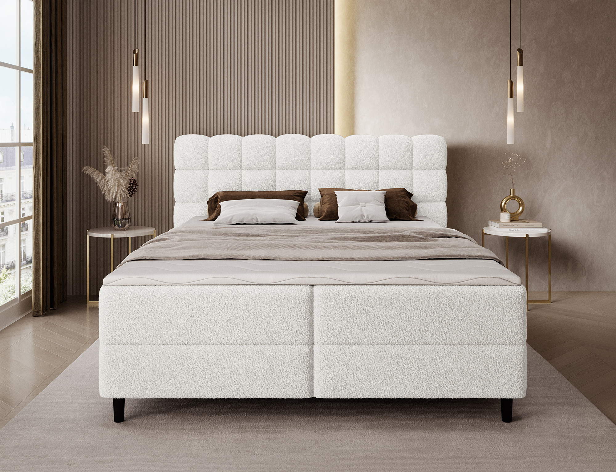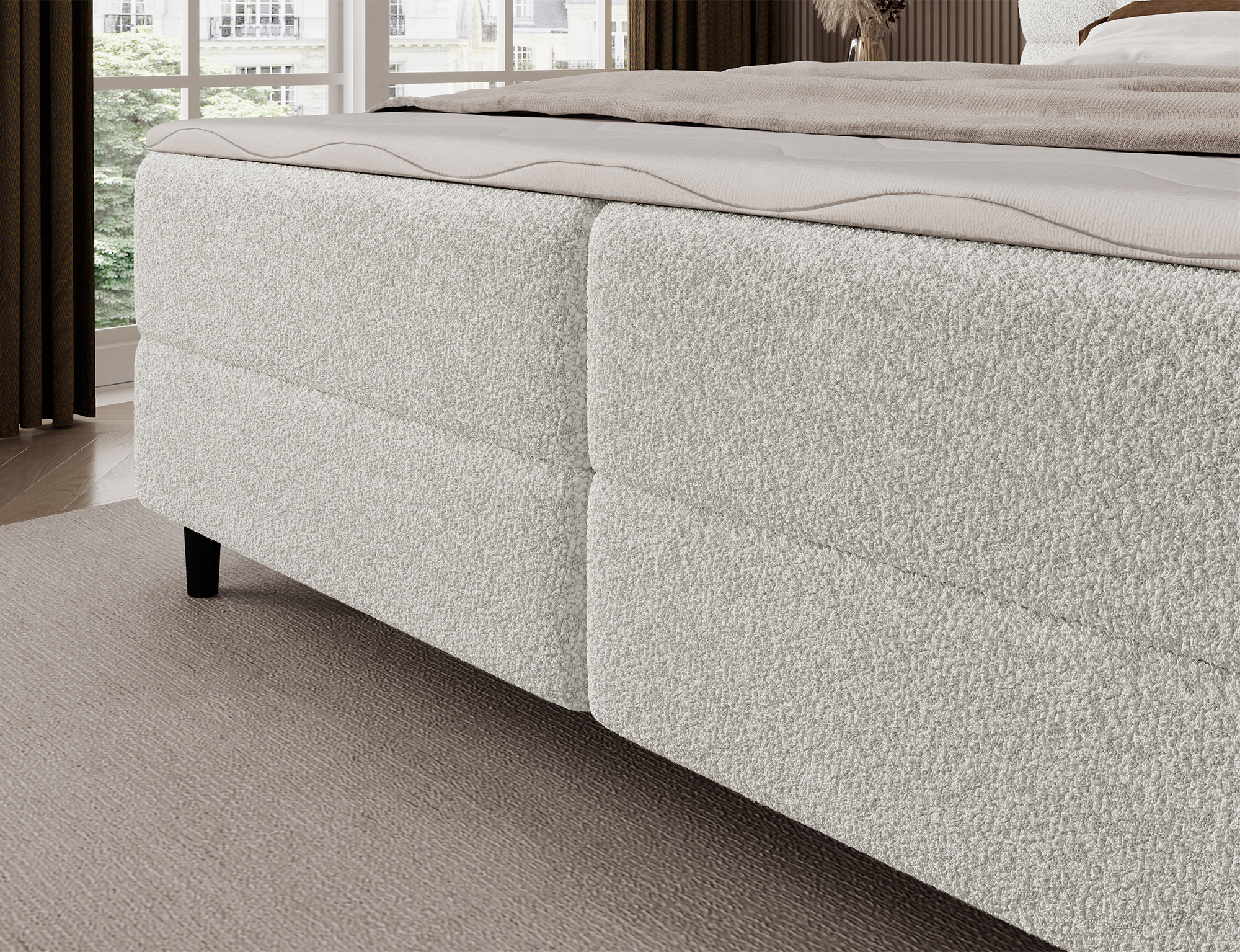 Kontinentálna posteľ Camma kombinuje moderný dizajn, funkčnosť a vynikajúci spací komfort, čo z nej robí ideálnu voľbu pre elegantnú a praktickú spálňu; je dostupná v troch veľkostiach – 140x200 cm, 160x200 cm a 180x200 cm – a dokonale sa prispôsobí ako priestoru, tak individuálnym potrebám, zatiaľ čo jej pevná konštrukcia s celkovou výškou 102 cm a výškou sedu 56 cm zaisťuje každodenné pohodlie; posteľ má hĺbku 222 cm a šírka závisí od zvoleného modelu – 162 cm, 182 cm alebo 202 cm – čo jej dodáva stabilný a impozantný vzhľad, ktorý pridáva luxusný nádych každému interiéru; čalúnená vysoko kvalitnou látkou s jemným dotykom a štýlovo prešívaným čelom, kombinuje modernú eleganciu s pohodlnou oporou pre čítanie alebo relaxáciu; praktický úložný box poskytuje priestor pre posteľnú bielizeň a pomáha udržiavať spálňu upratanú, čo robí posteľ Camma nielen pohodlnou, ale aj vysoko funkčnou; dizajn je doplnený 10 cm čiernymi drevenými nohami, ktoré pridávajú vizuálnu ľahkosť a uľahčujú upratovanie pod posteľou; model Camma je ideálnou voľbou pre tých, ktorí si cenia moderný štýl, eleganciu, odolnosť a pohodlie, zaisťujúce zdravý a pokojný spánok každú noc.