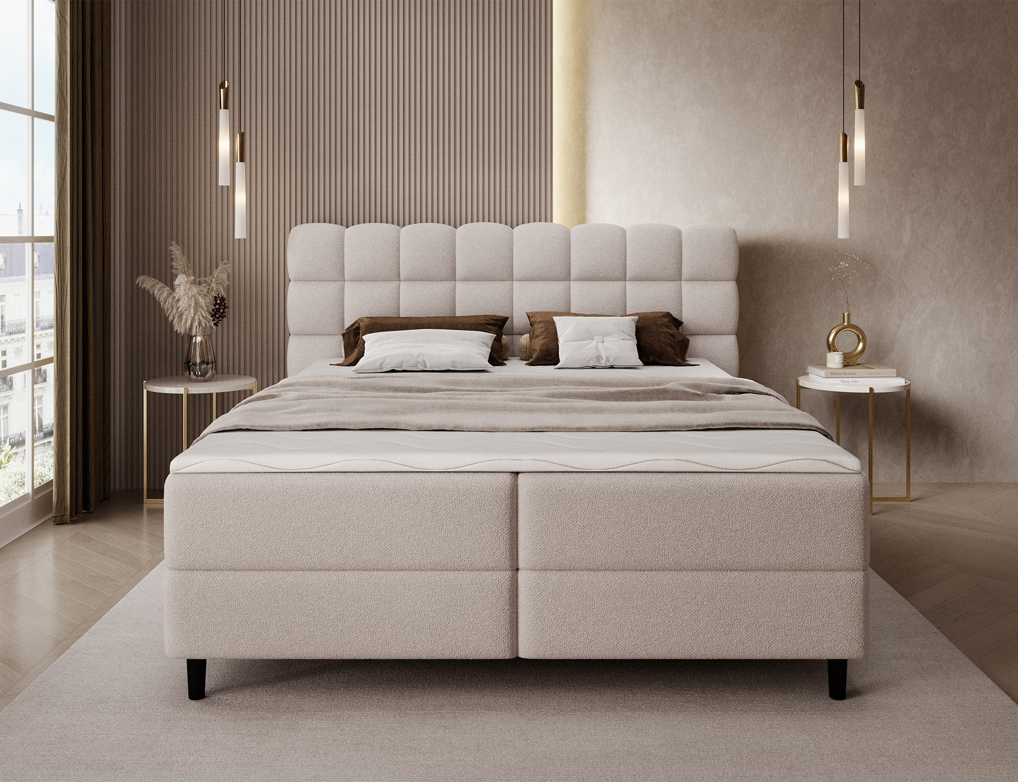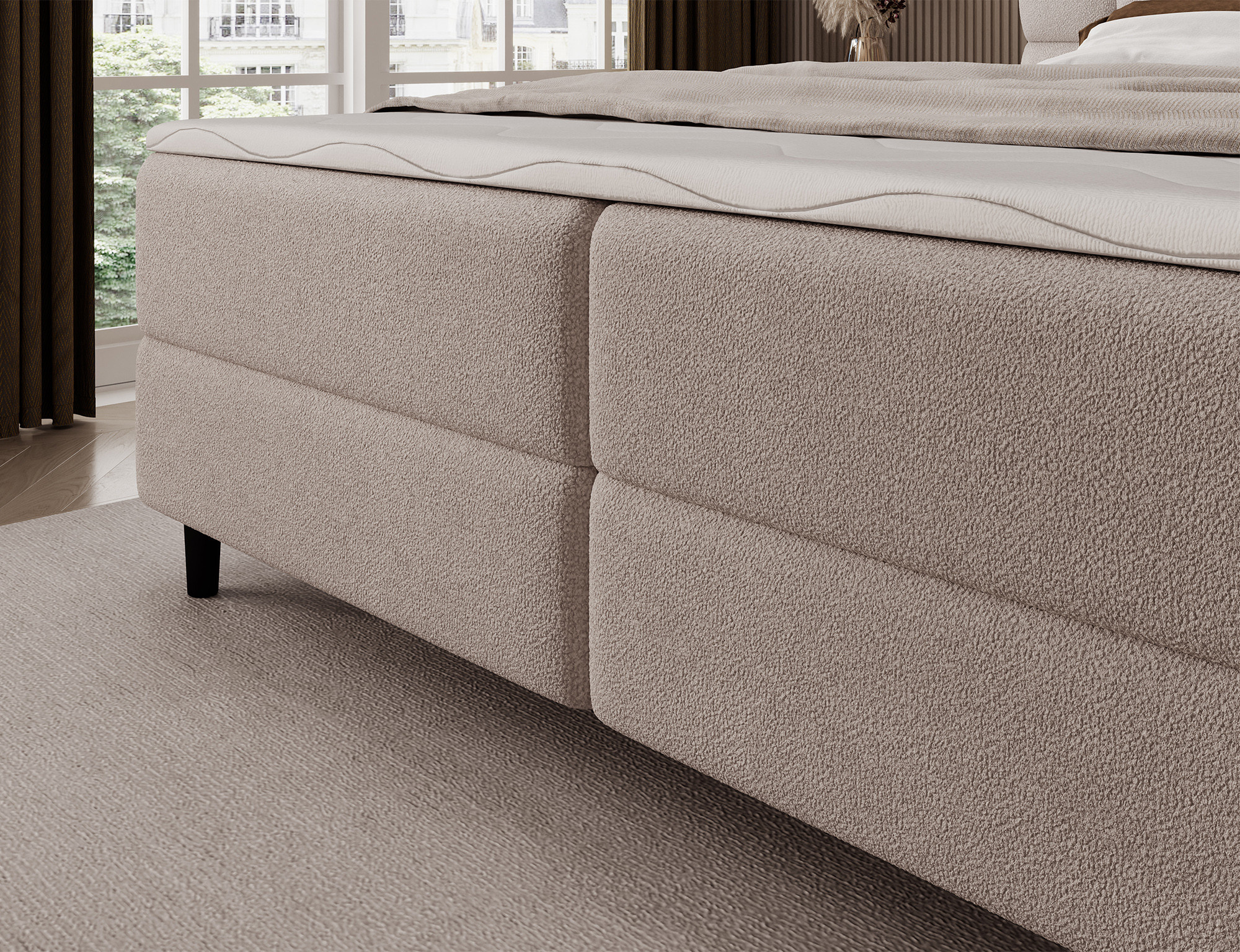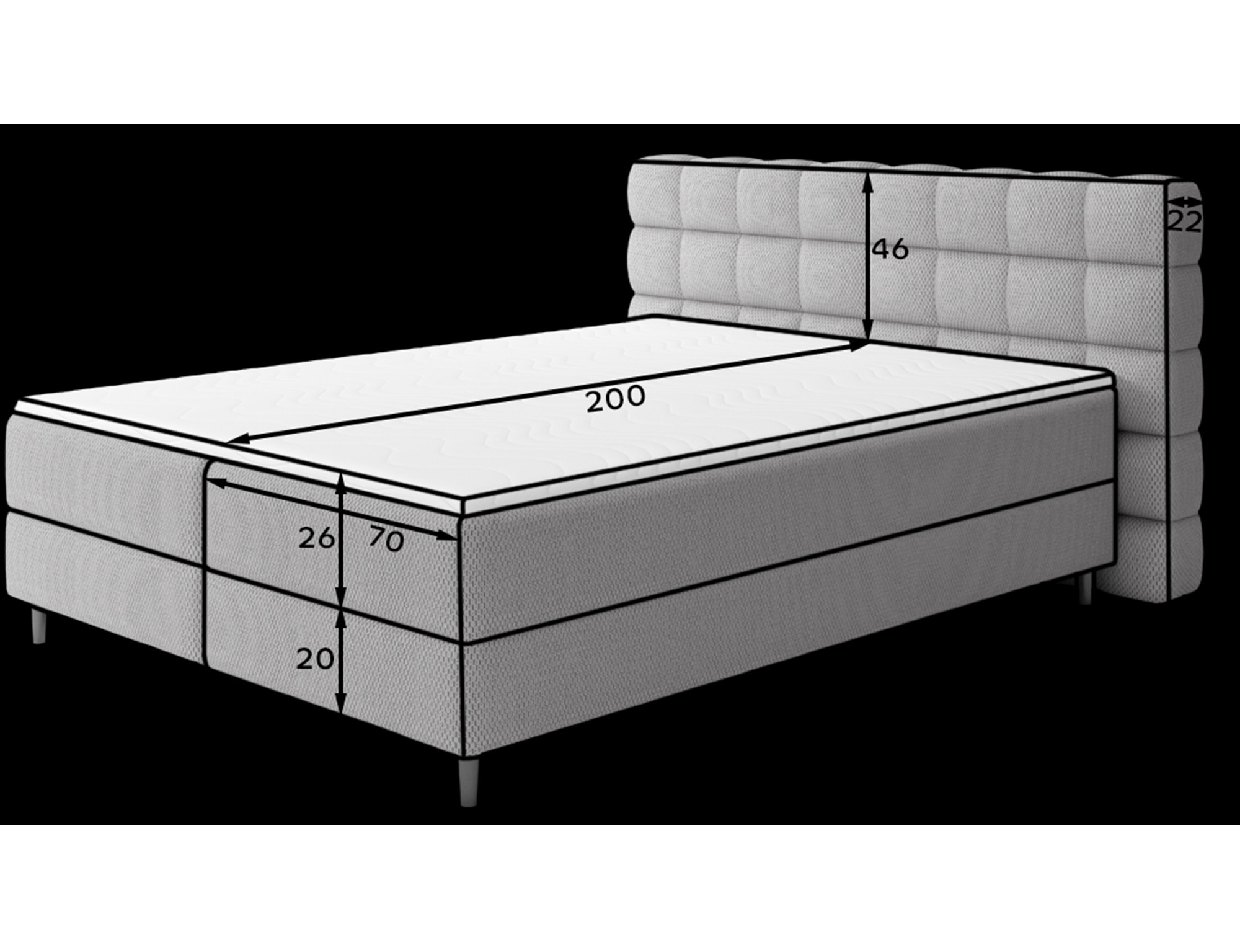 Kontinentálna posteľ Camma kombinuje moderný dizajn, funkčnosť a vynikajúci spací komfort, čo z nej robí ideálnu voľbu pre elegantnú a praktickú spálňu; je dostupná v troch veľkostiach – 140x200 cm, 160x200 cm a 180x200 cm – a dokonale sa prispôsobí ako priestoru, tak individuálnym potrebám, zatiaľ čo jej pevná konštrukcia s celkovou výškou 102 cm a výškou sedu 56 cm zaisťuje každodenné pohodlie; posteľ má hĺbku 222 cm a šírka závisí od zvoleného modelu – 162 cm, 182 cm alebo 202 cm – čo jej dodáva stabilný a impozantný vzhľad, ktorý pridáva luxusný nádych každému interiéru; čalúnená vysoko kvalitnou látkou s jemným dotykom a štýlovo prešívaným čelom, kombinuje modernú eleganciu s pohodlnou oporou pre čítanie alebo relaxáciu; praktický úložný box poskytuje priestor pre posteľnú bielizeň a pomáha udržiavať spálňu upratanú, čo robí posteľ Camma nielen pohodlnou, ale aj vysoko funkčnou; dizajn je doplnený 10 cm čiernymi drevenými nohami, ktoré pridávajú vizuálnu ľahkosť a uľahčujú upratovanie pod posteľou; model Camma je ideálnou voľbou pre tých, ktorí si cenia moderný štýl, eleganciu, odolnosť a pohodlie, zaisťujúce zdravý a pokojný spánok každú noc.