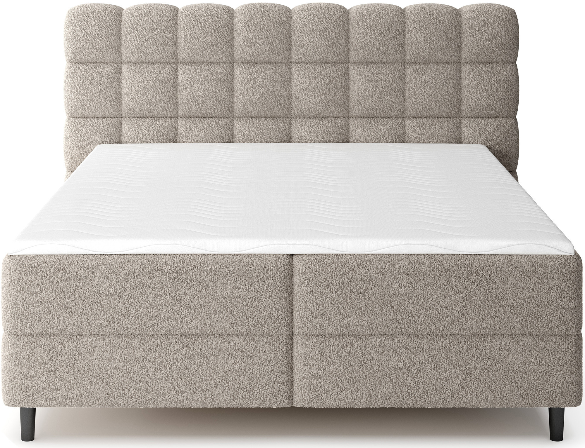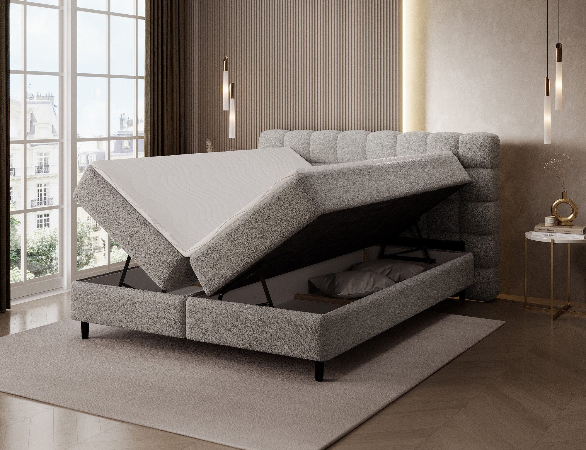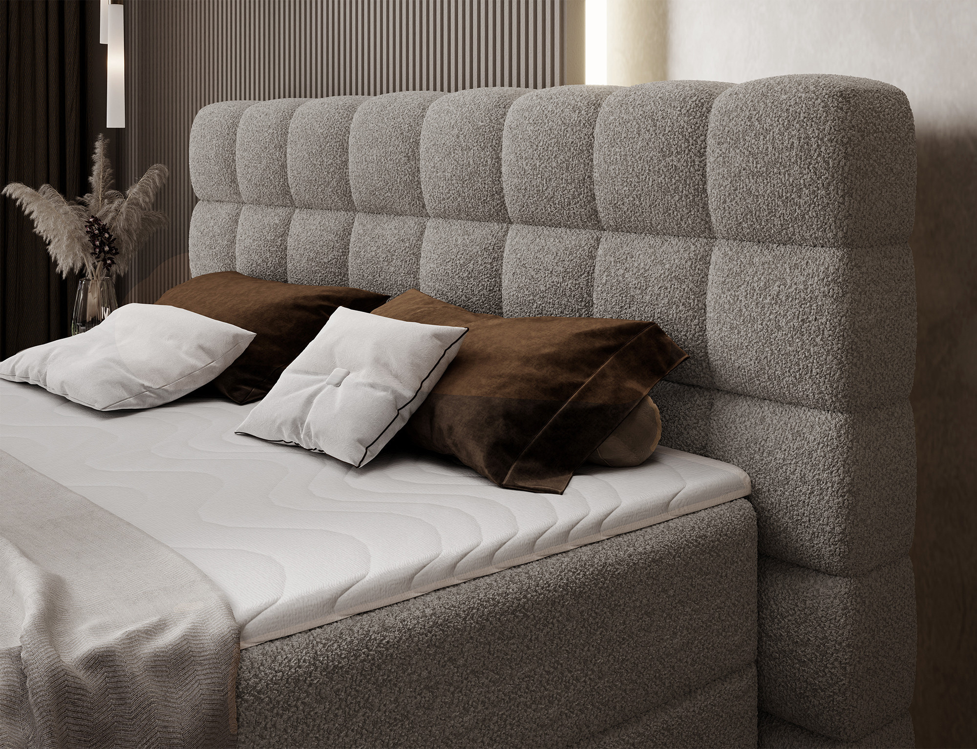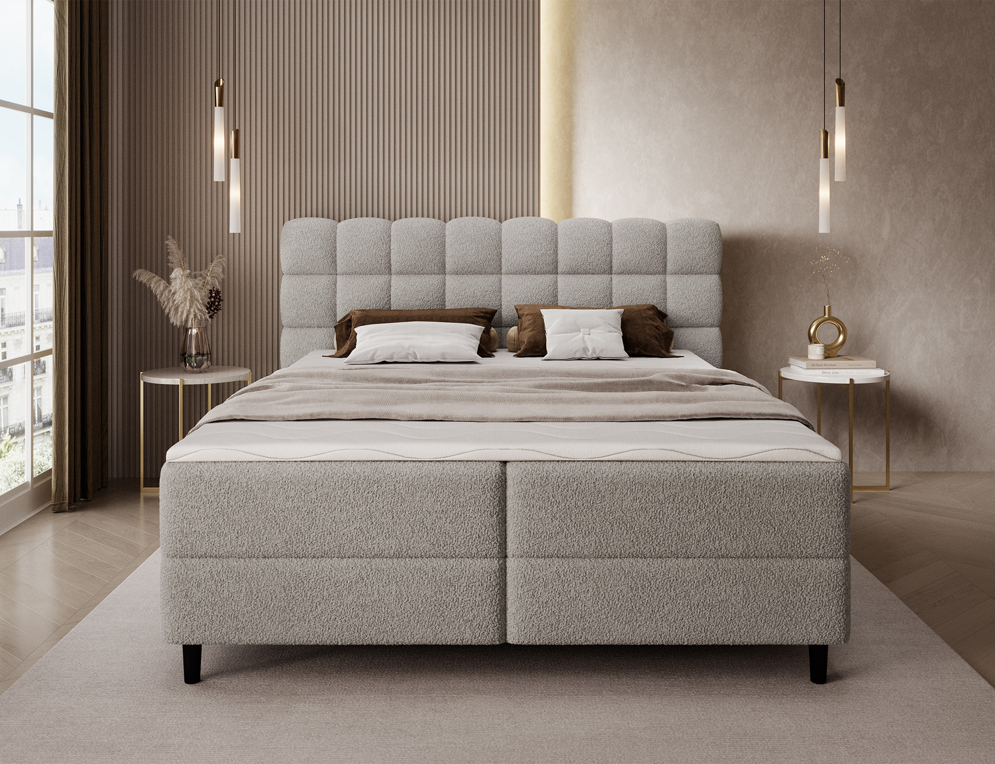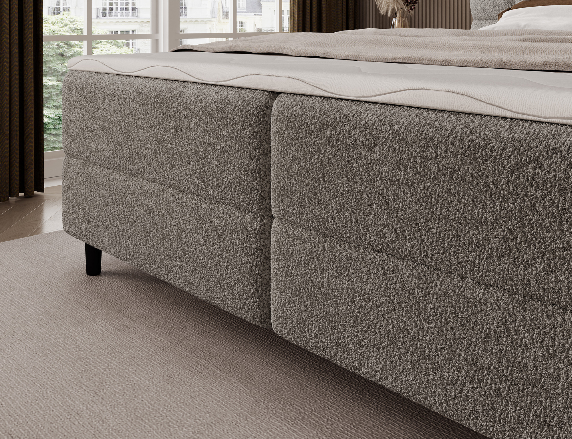 Kontinentálna posteľ Camma kombinuje moderný dizajn, funkčnosť a vynikajúci spací komfort, čo z nej robí ideálnu voľbu pre elegantnú a praktickú spálňu; je dostupná v troch veľkostiach – 140x200 cm, 160x200 cm a 180x200 cm – a dokonale sa prispôsobí ako priestoru, tak individuálnym potrebám, zatiaľ čo jej pevná konštrukcia s celkovou výškou 102 cm a výškou sedu 56 cm zaisťuje každodenné pohodlie; posteľ má hĺbku 222 cm a šírka závisí od zvoleného modelu – 162 cm, 182 cm alebo 202 cm – čo jej dodáva stabilný a impozantný vzhľad, ktorý pridáva luxusný nádych každému interiéru; čalúnená vysoko kvalitnou látkou s jemným dotykom a štýlovo prešívaným čelom, kombinuje modernú eleganciu s pohodlnou oporou pre čítanie alebo relaxáciu; praktický úložný box poskytuje priestor pre posteľnú bielizeň a pomáha udržiavať spálňu upratanú, čo robí posteľ Camma nielen pohodlnou, ale aj vysoko funkčnou; dizajn je doplnený 10 cm čiernymi drevenými nohami, ktoré pridávajú vizuálnu ľahkosť a uľahčujú upratovanie pod posteľou; model Camma je ideálnou voľbou pre tých, ktorí si cenia moderný štýl, eleganciu, odolnosť a pohodlie, zaisťujúce zdravý a pokojný spánok každú noc.