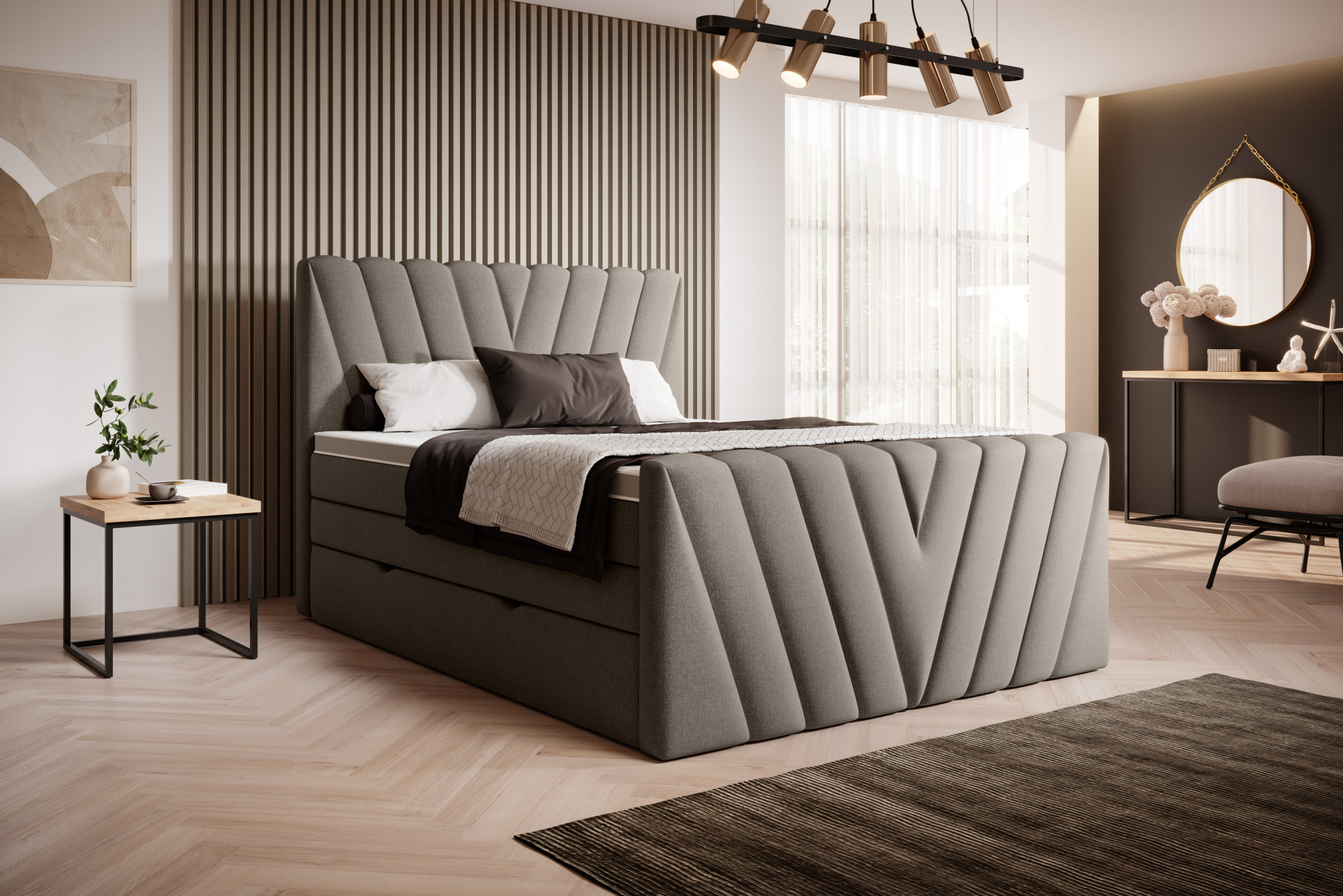 Kontinentálna posteľ Candice prináša do spálne odvahu vďaka čalúneniu, ktoré je k dispozícii v mnohých rôznych farbách z kolekcie látok ELTAP. Okrem toho je produkt dostupný v 3 veľkostiach spacie plochy: 140/160/180x200 centimetrov. Boxspring Candice bude určite atraktívnym základom pre mnoho spální, pretože je štýlová a pohodlná. Čalúnené operadlo tohto kusu nábytku umožňuje jeho umiestnenie v rôznych konfiguráciách, dokonca aj uprostred miestnosti. Ďalšou výhodou našej čalúnenej postele sú mimoriadne pohodlné matrace zahrnuté v sade.Ako boxspringová posteľ je Candice vybavená spodným matracom a horným matracom. Prvý je vyplnený penou T25 a pružinami Bonnel. Tvrdosť spodného matraca je H2/3, zatiaľ čo tvrdosť horného matraca je H3. Navyše je topper tejto čalúnenej postele obojstranný a vybavený zipsom. To určite uľahčí udržiavanie matraca v čistote. Vďaka všetkým týmto prvkom je kontinentálna posteľ Candice neuveriteľne pohodlná a vyzerá krásne v každom interiéri.