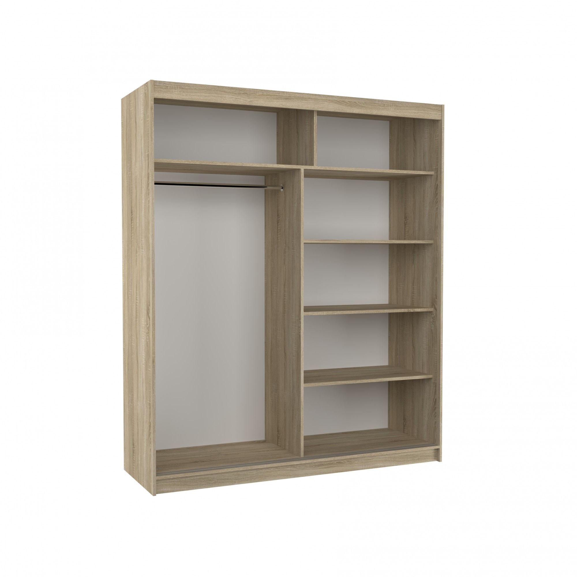 Šatní skriňa s posuvnými dverami a zrkadlom DALLAS je ideálnym spôsobom, ako usporiadať priestor. Nábytok je vybavený priestrannými policami a tyčou, na ktorú môžete zavesiť šaty, obleky, vrchné odevy alebo košele. Na čelnú stranu boli pripevnené zrkadlá, ktoré opticky zväčšujú priestor. Vďaka tomu, že skriňa je posuvná, nemusíte vyčleňovať ďalšie miesto na otvorenie dverí, čo z nej robí ideálne riešenie pre malú izbu alebo úzku predsieň.