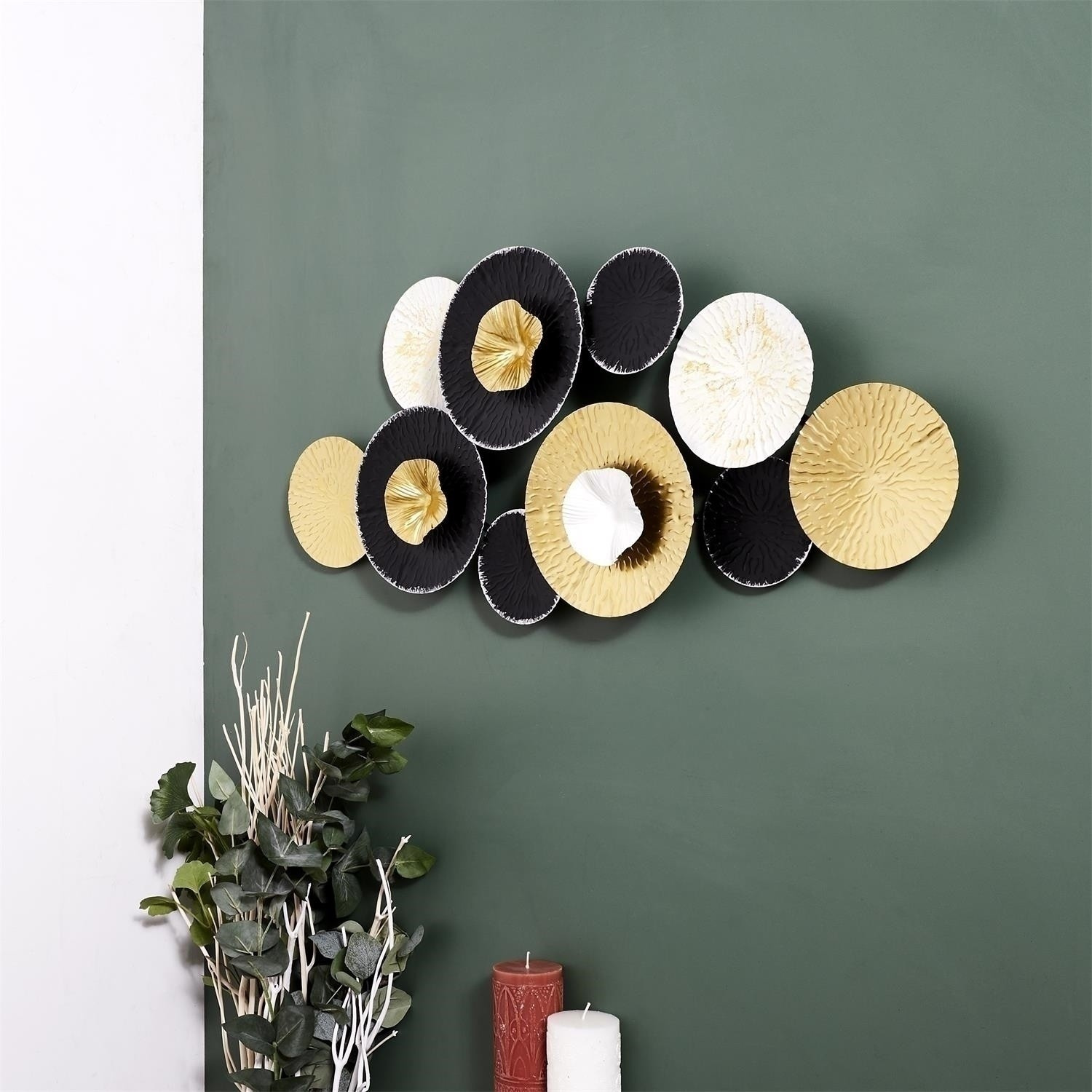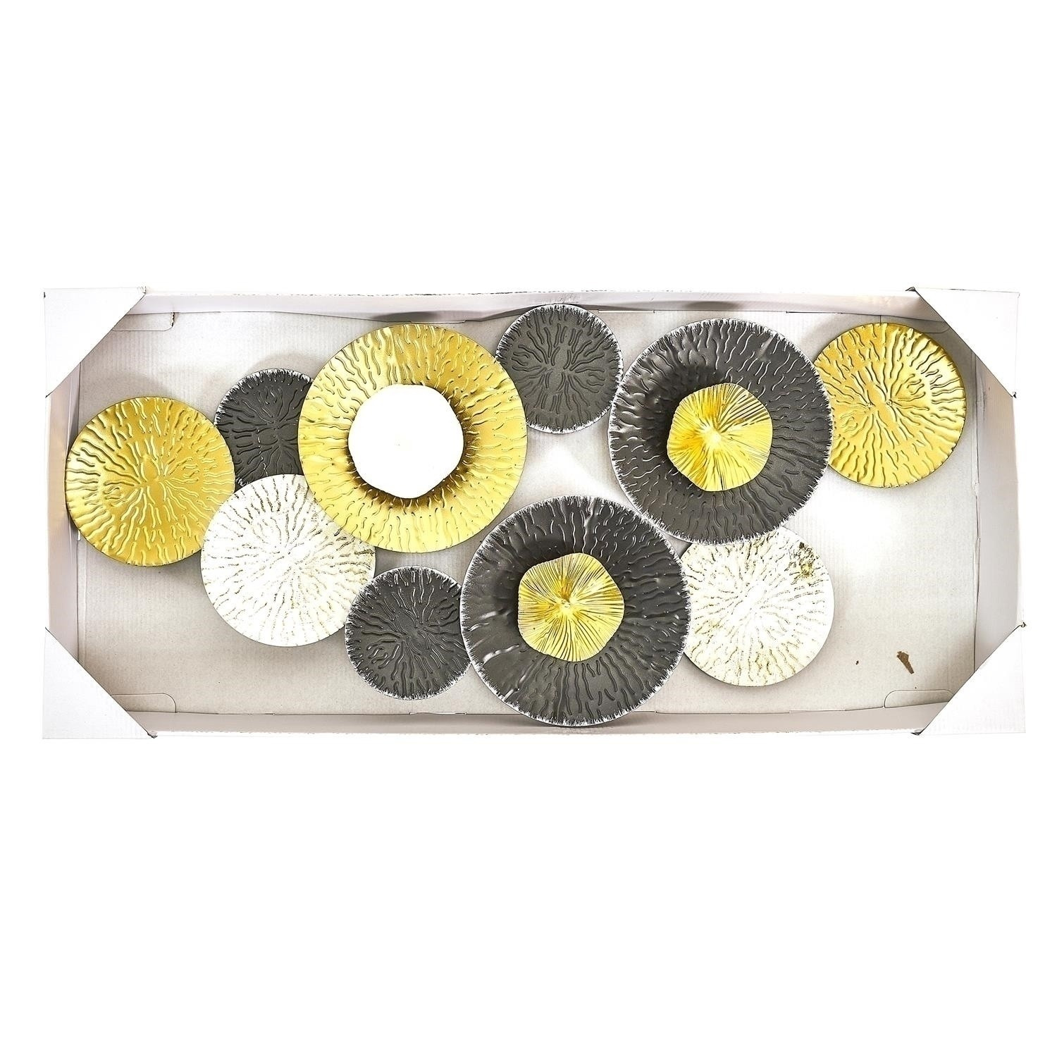 Kovová dekorácia zložená z desiatich rôznofarebných rozet spôsobí, že doteraz prázdna stena sa stane ozdobou celej miestnosti. Dekorácie na stenu umožnia ozdobiť stenu nad písacím stolom alebo komodou. Dekorácie v čierno-bielej farbe sa hodia nielen do moderných interiérov. Môže byť tiež ozdobou v interiéri v štýle glamour alebo boho. Materiál: Kov, Rozmery balenia: 31,5x83,5x6cm. Max. 4 ks v kartóne.