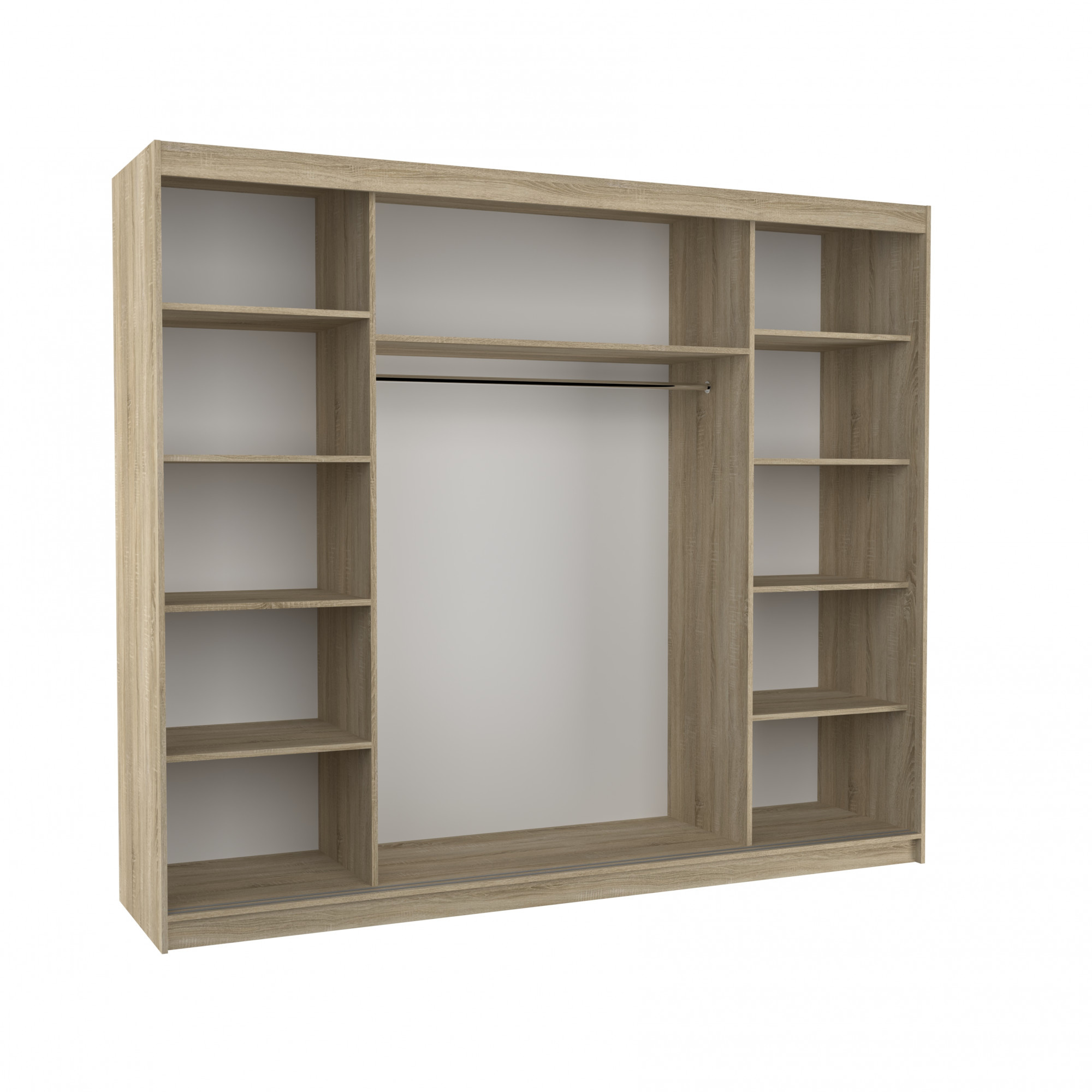 Posuvná skriňa so zrkadlom DENIS je ideálnym spôsobom, ako usporiadať priestor. Nábytok je vybavený priestrannými policami a tyčou, na ktorú môžete zavesiť šaty, obleky, vrchné odevy alebo košele. Na čelnej strane bolo pripevnené zrkadlo, ktoré opticky zväčšuje priestor. Vďaka tomu, že skriňa je posuvná, nemusíte vyčleňovať ďalšie miesto na otvorenie dverí, čo z nej robí ideálne riešenie pre malú izbu alebo úzku predsieň.