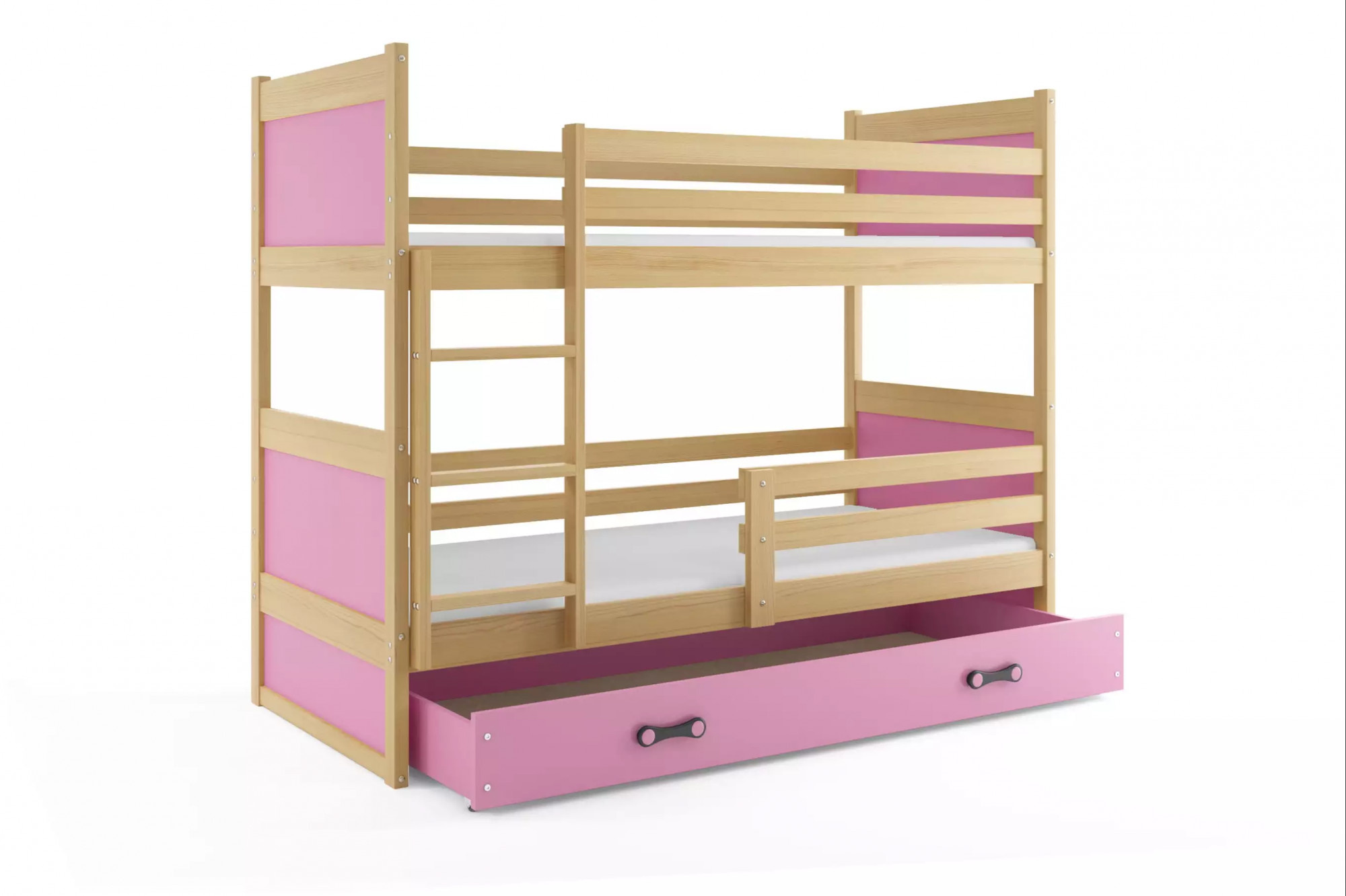 Detská poschodová posteľ RICO so zásuvkou 90x200 cm, bez matraca, Prírodná/Ružová