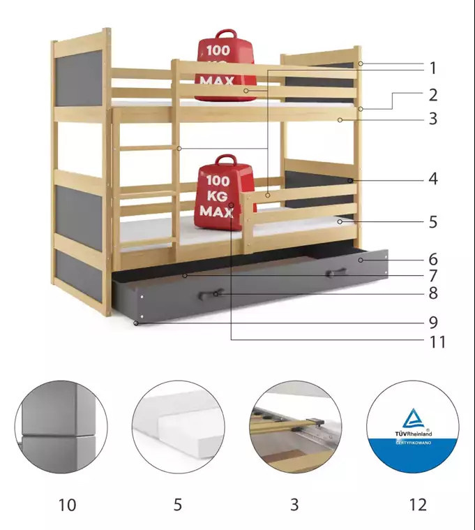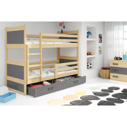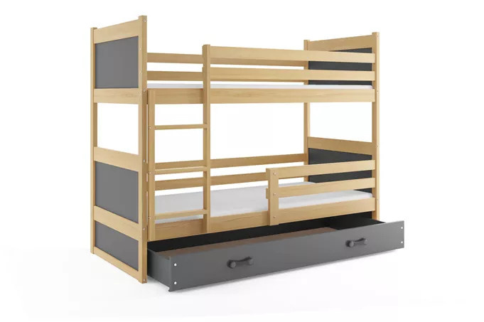 Detská poschodová posteľ RICO so zásuvkou 90x200 cm, vrátane matracov, Prírodná/Grafit