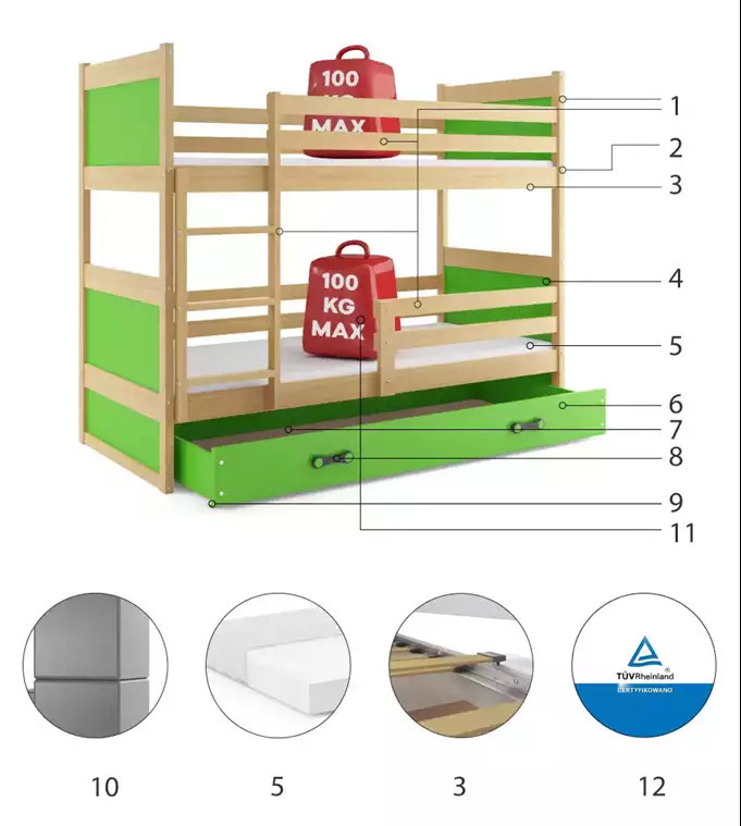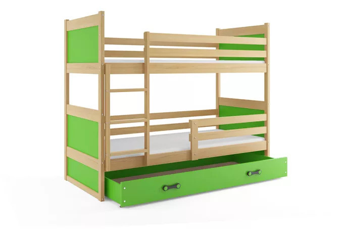 Detská poschodová posteľ RICO so zásuvkou 90x200 cm, vrátane matracov, Prírodná/Zelená