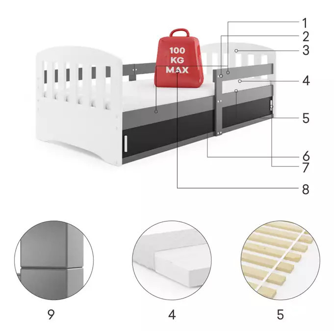 - Rám postele - vyrobený z borovicového dreva, lakovaný vodným lakom.