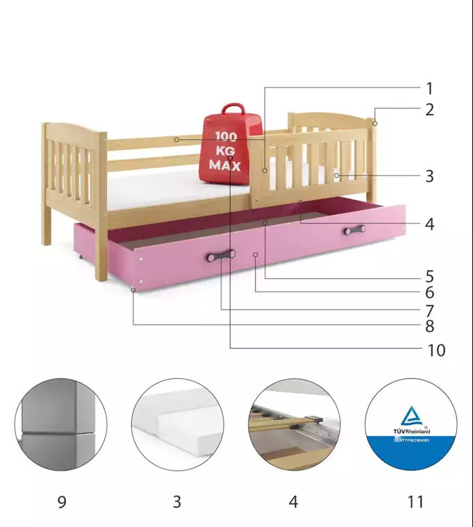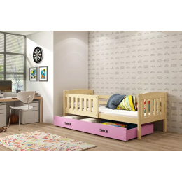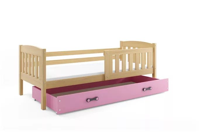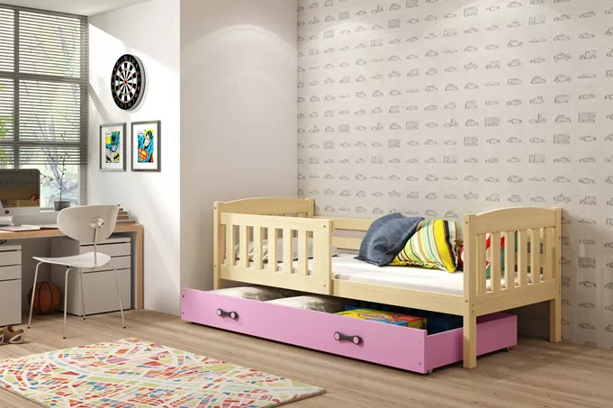 Detská posteľ KUBUS 80x160 cm so zásuvkou, s matracom, Prírodná/Ružová