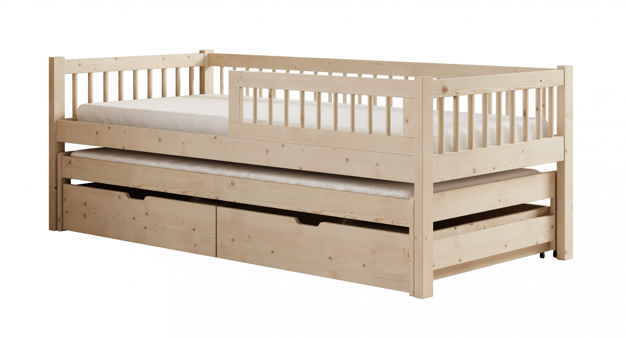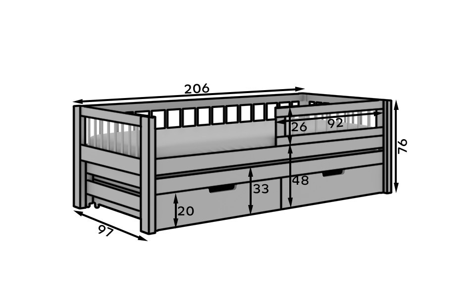 Detská posteľ Orio – to je ideálne riešenie pre súrodencov alebo deti, ktoré potrebujú viac priestoru. Dvojlôžková posteľ je k dispozícii v dvoch veľkostiach: 180x80 cm a 200x90 cm, čo umožňuje prispôsobiť ju rôznym potrebám a veľkostiam izby.Vyrobené z pevných materiálov, posteľ je k dispozícii v dvoch atraktívnych farebných variantoch: biela a borovica, čo uľahčuje jej zladenie s interiérom každej miestnosti. Ďalšou výhodou sú **dva kontajnery** umiestnené pod posteľou, ktoré poskytujú dodatočný priestor na uloženie posteľnej bielizne, hračiek alebo iných vecí, čím udržiavajú poriadok v detskej izbe.Posteľ Orio spája funkčnosť s estetikou, ponúka pohodlný spánok a praktické riešenia pre každý deň.