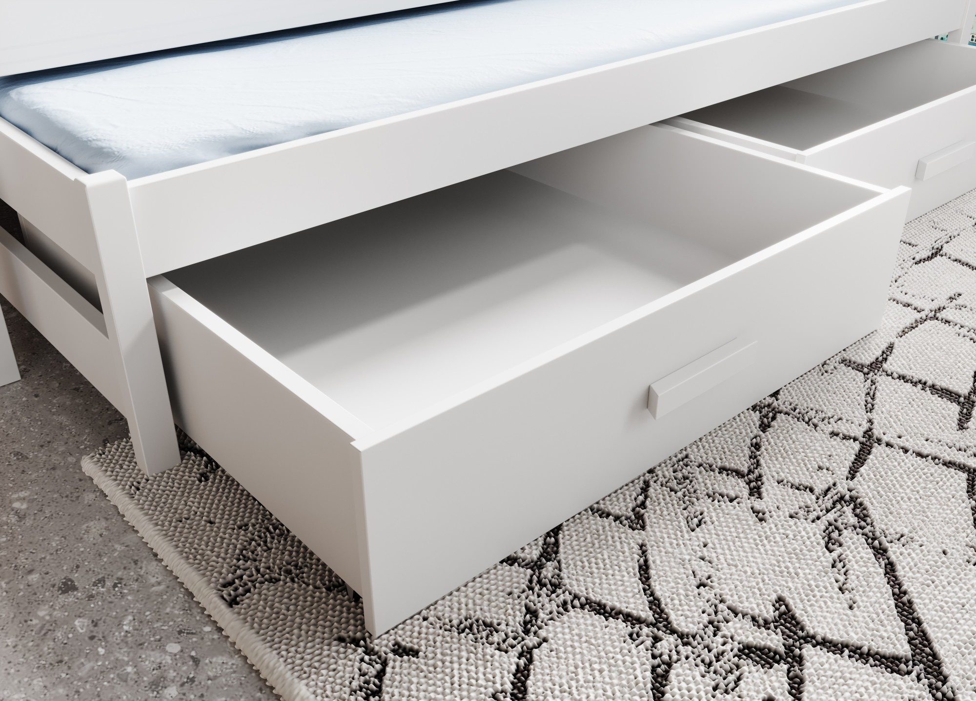 Detská dvojlôžková posteľ Olen je kombináciou moderného dizajnu a výnimočnej funkčnosti, ideálna pre tých, ktorí si cenia praktické riešenia v detskej izbe. Vyrobené z vysoko kvalitných materiálov, zaručuje trvanlivosť a pohodlie pri používaní. Vďaka funkcii vysúvacej matrace možno posteľ ľahko premeniť na priestor pre ďalšiu osobu, čo z nej robí vynikajúcu voľbu pre detské a hosťovské izby. Praktické dve priestranné zásuvky, umiestnené v spodnej časti postele, poskytujú ďalší úložný priestor pre posteľnú bielizeň, oblečenie alebo iné doplnky. Pevná konštrukcia vyrobená z odolných materiálov zaručuje stabilitu a dlhú životnosť nábytku. Jednoduchá, elegantná forma postele Olen sa dokonale hodí k rôznym štýlom interiérov – od minimalistických po klasické.