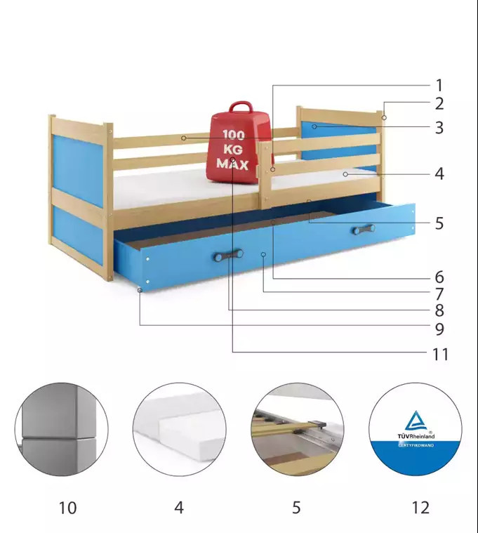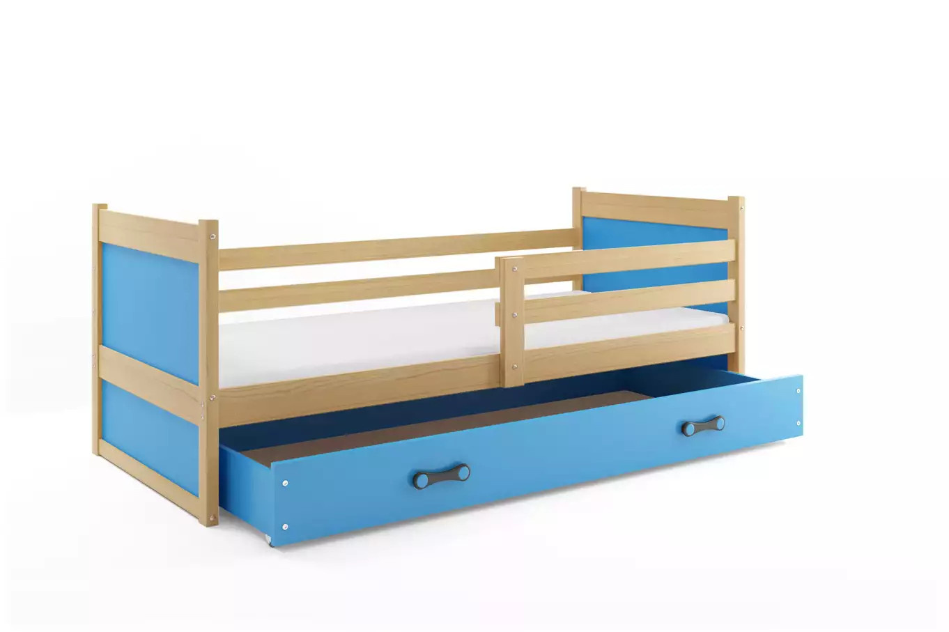 Detská posteľ RICO 90x190 cm so zásuvkou, bez matraca, Prírodná/Modrá