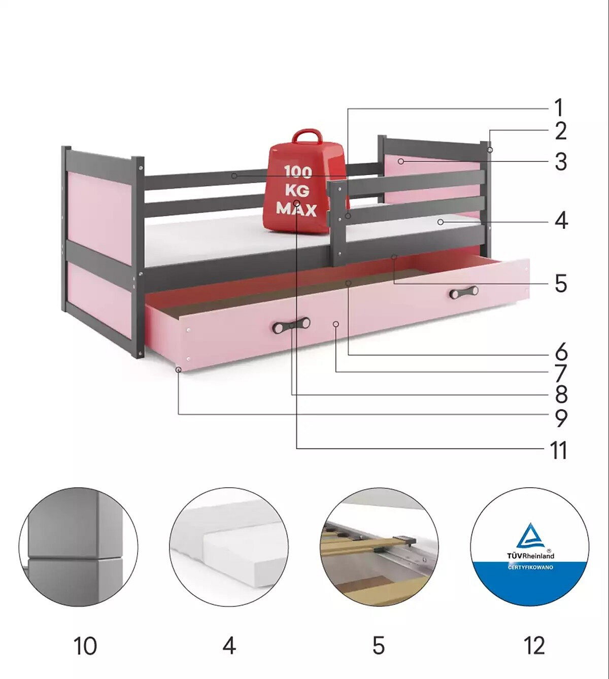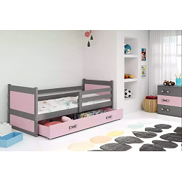 Detská posteľ RICO 90x190 cm so zásuvkou, s matracom, Grafit/Ružová