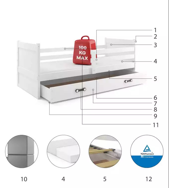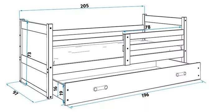 Detská posteľ RICO 90x200 cm so zásuvkou, bez matraca, Biela/Biela