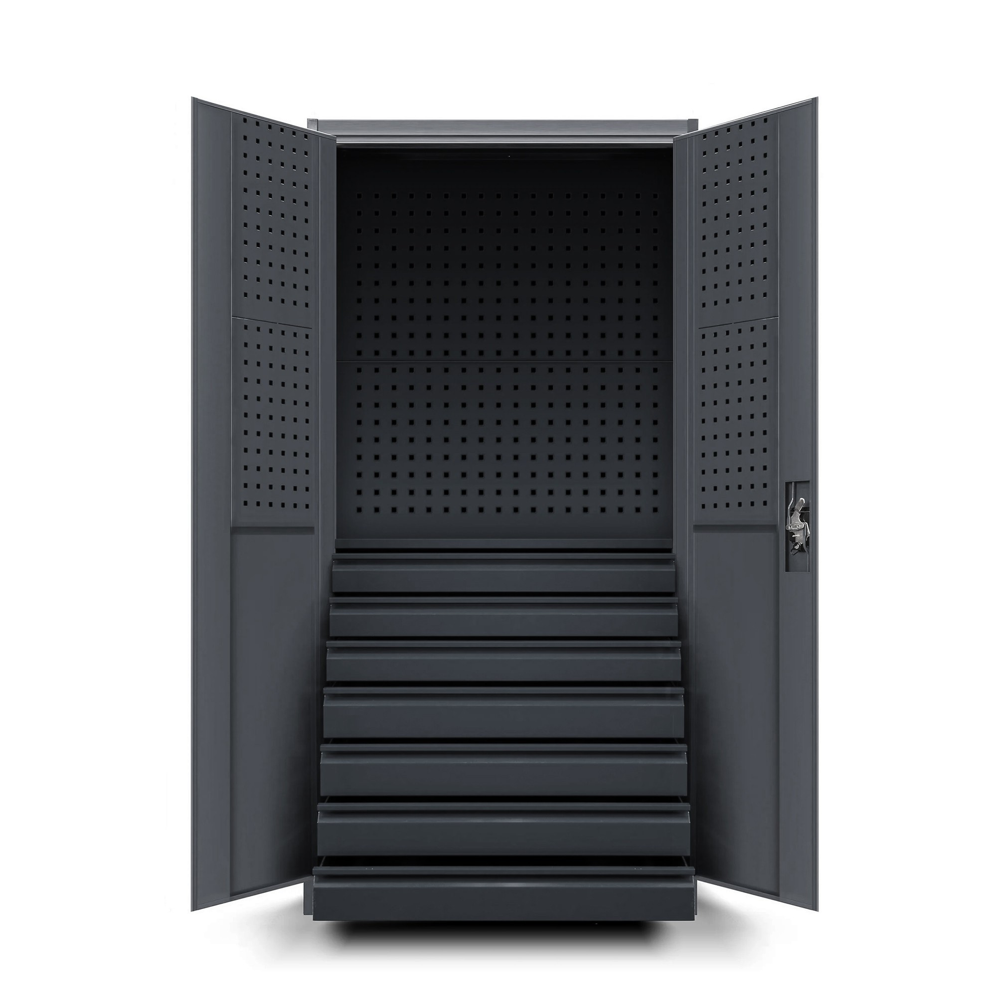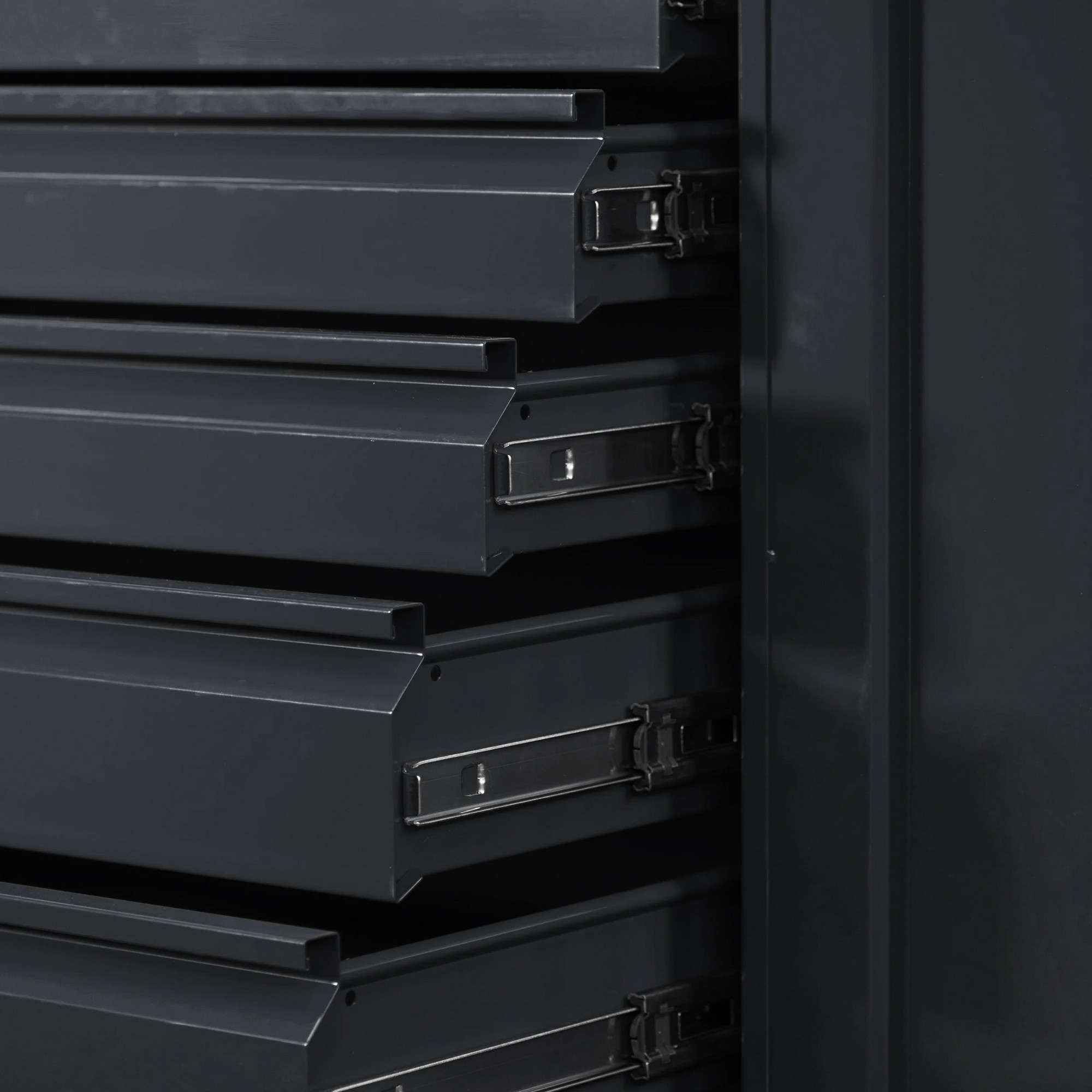 Hlavnú časť skrine tvoria sedem priestranných zásuviek, ktoré sa pohybujú na spoľahlivých pojazdoch. Zásuvky sa otvárajú a zatvárajú hladko a ticho, takže sa môžete plne sústrediť na svoju prácu. Vďaka rôznym výškam zásuviek (3 zásuvky s výškou 9 cm a 4 zásuvky s výškou 11 cm) môžete do skrine uložiť náradie rôznych veľkostí a udržiavať v dielni dokonalý poriadok.