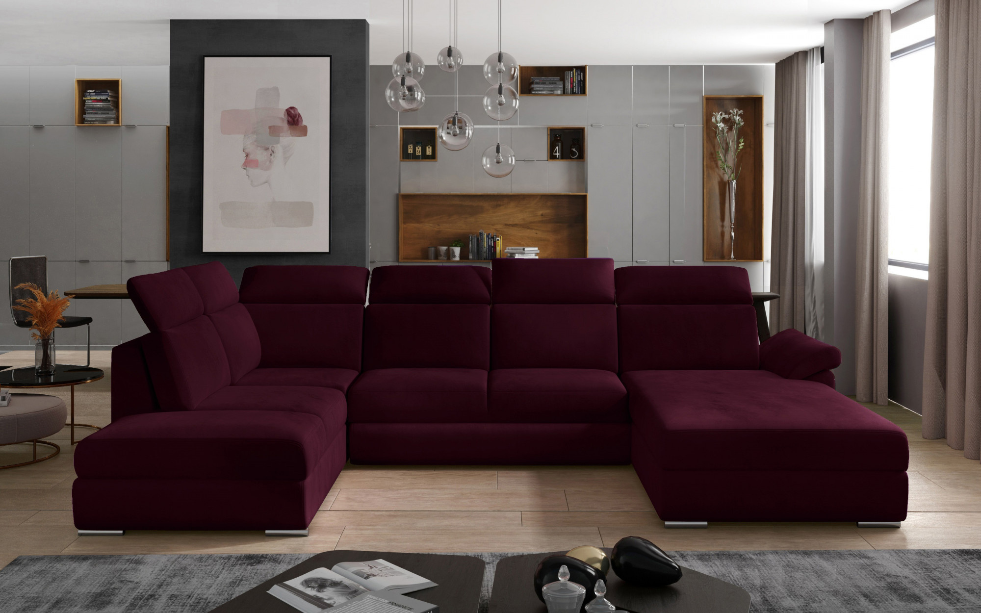 Evanell je priestranná, pohodlná a štýlová rohová pohovka, ktorá jednoducho ohromí - nielen svojím klasickým telom, ktoré dopĺňa moderné prevedenie jednotlivých prvkov, ale aj maximálnym pohodlím, ktoré možno zažiť na pohovke o rozmeroch 330 x 216 x 102 cm. Pohovka Evanell sa ukáže ako ideálny kus nábytku pre dennú relaxáciu, ale môže tiež slúžiť ako miesto na spanie. Delfíní dizajn umožňuje rýchlo a bez námahy prispôsobiť nábytok vašim aktuálnym potrebám, čím poskytuje pohodlný priestor na odpočinok v noci. Funkčnosť nábytku je tiež vylepšená priestranným úložným priestorom na posteľnú bielizeň, ktorý sa nachádza v otomane. Sedák nábytku je vyrobený z odolnej vlnitej pružiny a elastickej peny T30, ktoré zaručujú výnimočné pohodlie, maximálnu mäkkosť a odolnosť proti otlakom. Za zmienku stojí aj vysoké, tvarované opierky chrbta, nastaviteľné opierky hlavy, šikmé opierky rúk, čalúnená zadná časť rohovej pohovky, ako aj dostupnosť pohovky v mnohých farebných variantoch. Evanell je kus nábytku, ktorý splní všetky vaše očakávania - od obdivu estetických kvalít až po maximálne pohodlie ako pohovky, tak postele.