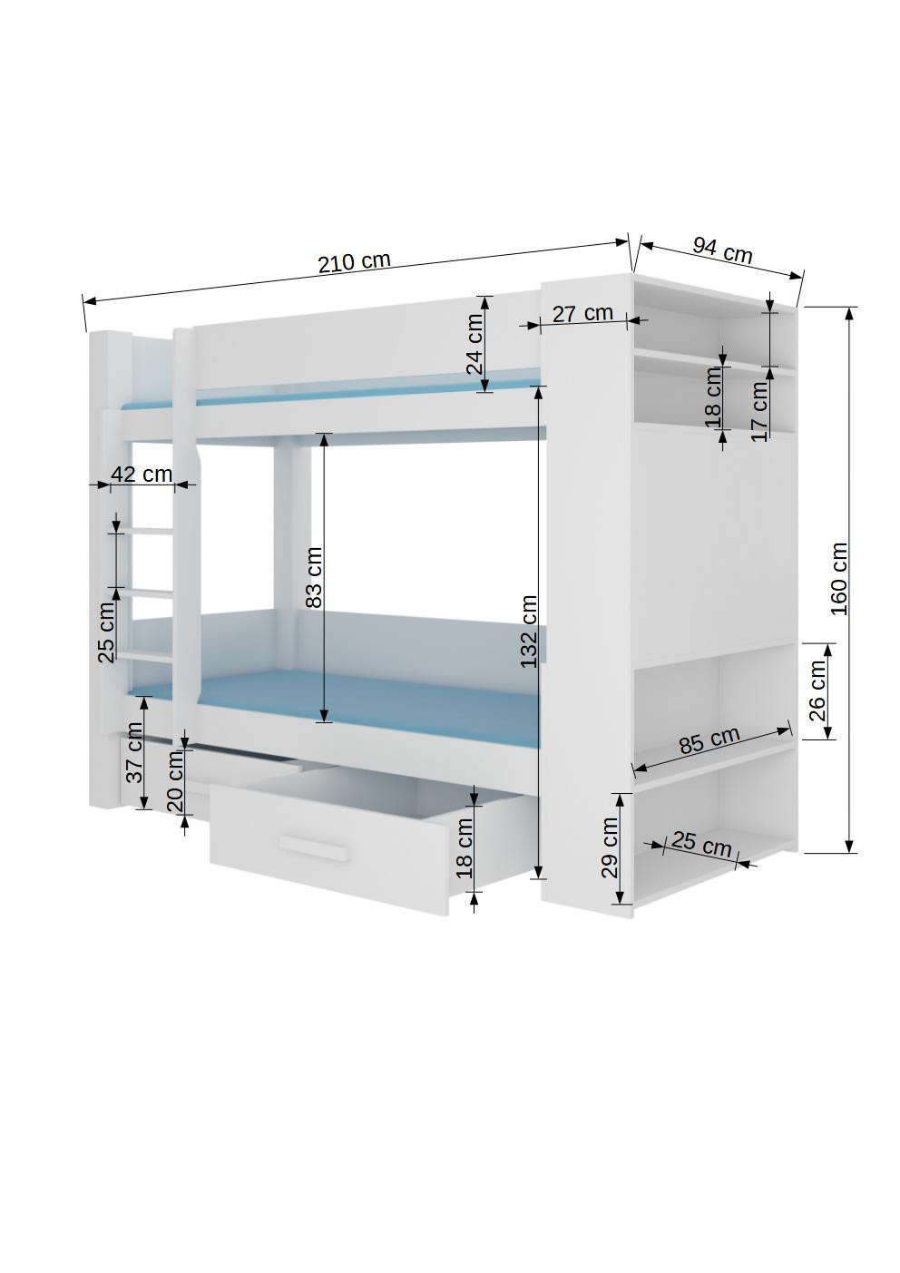 Poschodová 2-lôžková posteľ GARET je skvelý nápad na úsporu miesta v malej detskej izbe. Nábytok obsahuje schodíkový rebrík a dve priestranné a funkčné zásuvky na posteľnú bielizeň. Navyše na dvoch úrovniach boli namontované zábradlia zvyšujúce bezpečnosť počas spánku. Model GARET má police umiestnené ako z vnútornej, tak z vonkajšej strany postele. Matrace nie sú súčasťou postele.