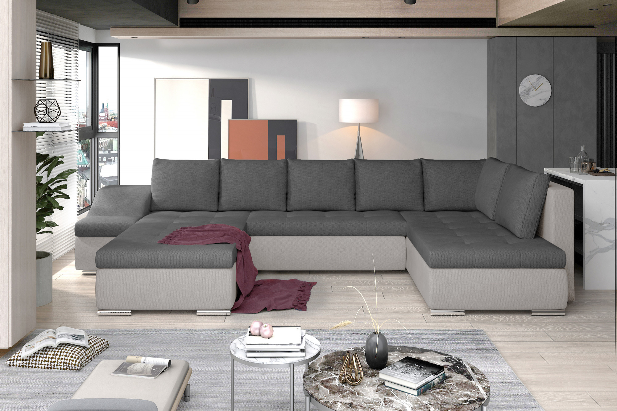 Giovanni je mimoriadne elegantná, priestranná a inovatívna rohová pohovka v tvare U s rozmermi 340 x 200 x 88 cm. Tento nábytok má pohodlné, mäkké sedadlo vyrobené z odolnej vlnitej pružiny a tiež z pružnej peny T30, ktorá je odolná nielen proti poškodeniu, ale aj proti deformáciám a škrabancom všetkých typov. Moderný dizajn v klasickom štýle bol vybavený ďalším bočným prvkom, ktorý slúži ako priestranná opierka rúk, a zároveň môže byť ďalším sedadlom. Naša rohová sedačka je vybavená funkciou spania s rozmermi 295 x 120 cm a tiež úložným priestorom na lôžkoviny. Medzi vlastnosti rohovej pohovky Giovanni môžeme zahrnúť: zaoblené hrany rohovej pohovky, ktoré jej dodávajú eleganciu, strieborné kovové nohy, širokú opierku ruky, vlnité, padajúce dole, štýlové prešívanie na sedákoch, rovnako ako priestranné vankúše. Výberom našej atraktívnej rohovej pohovky, ktorá je nielen vizuálne, ale aj funkčne príťažlivá, si môžete byť istí, že nájdete všetko, čo potrebujete na dosiahnutie maximálnej spokojnosti vyplývajúcej z pohodlia, ktoré ponúkame.