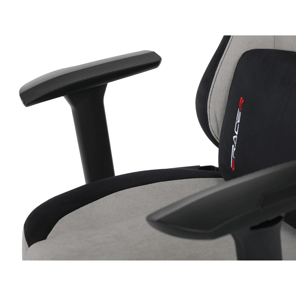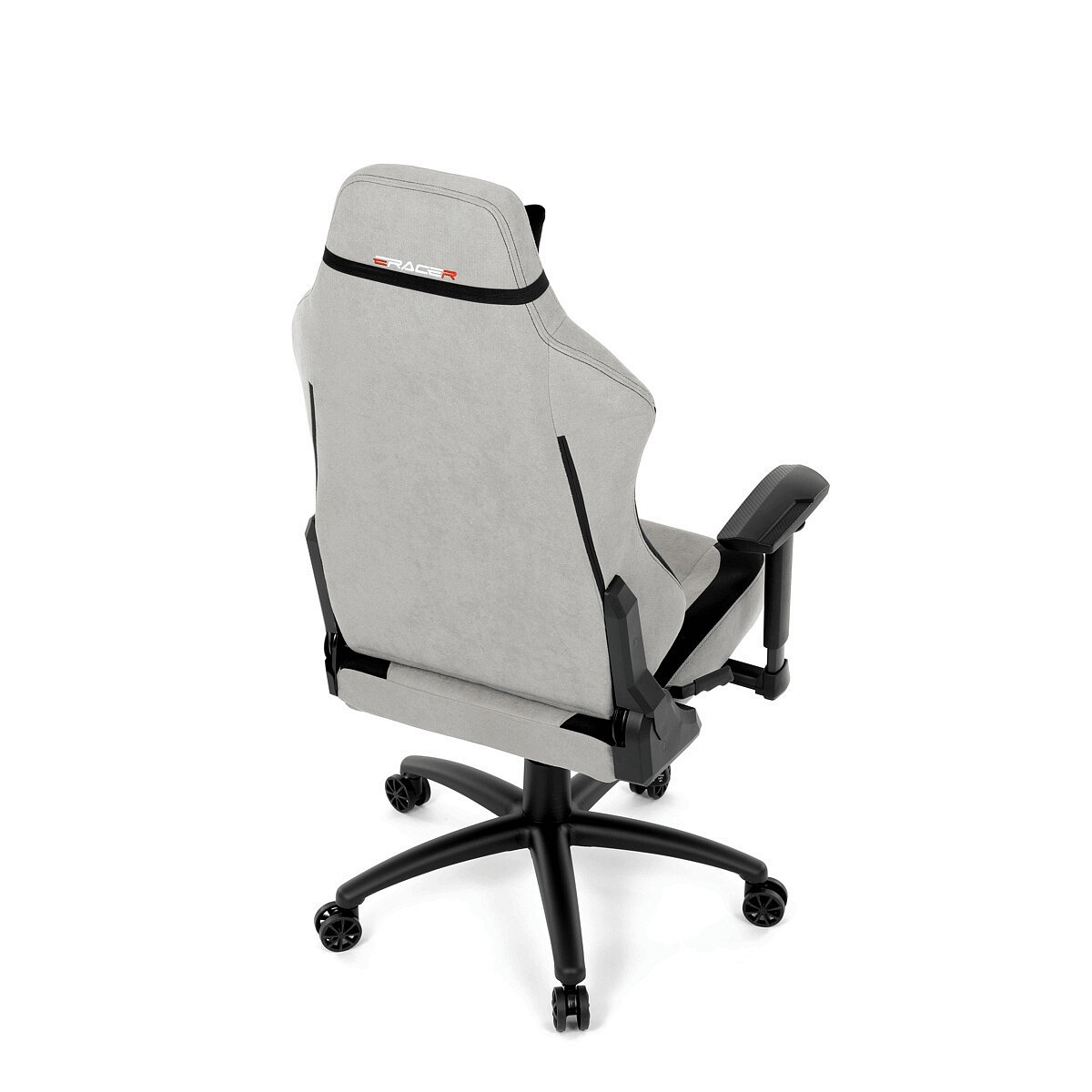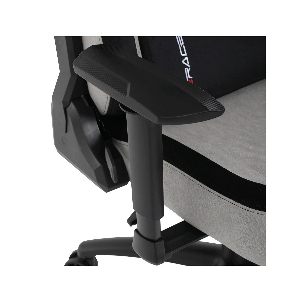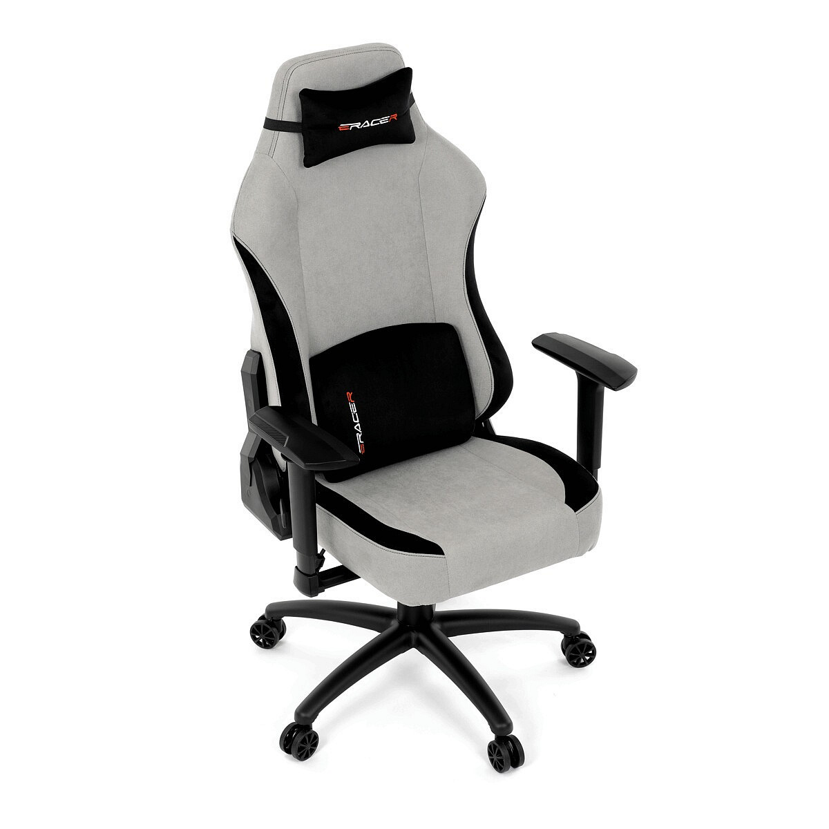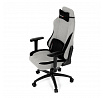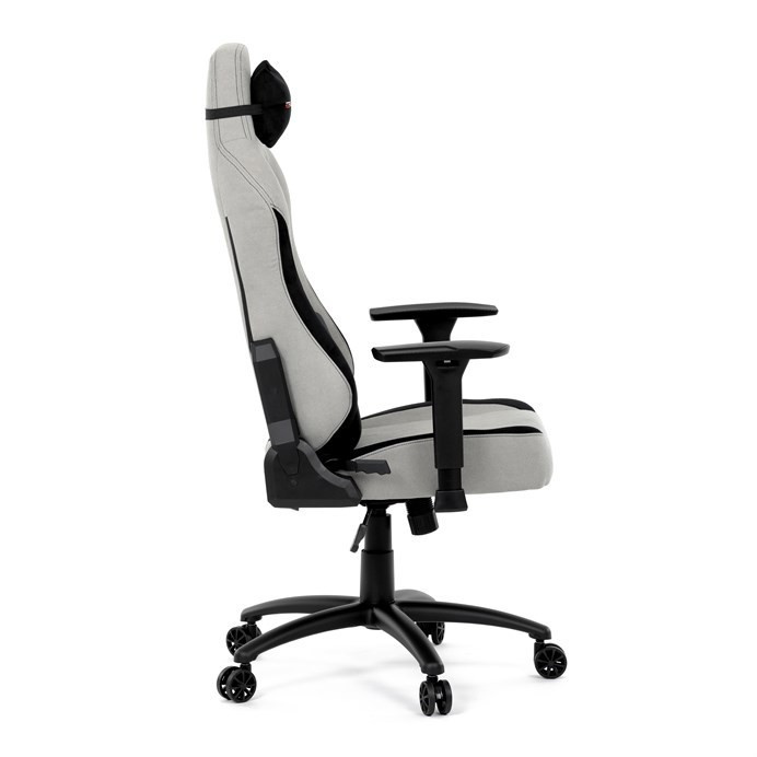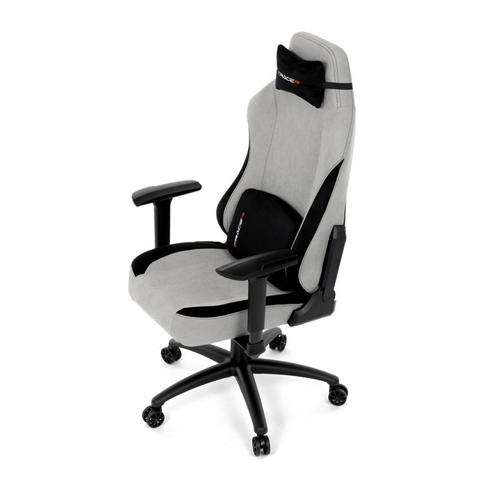Herná stolička, strieborná látka, hojdací mechanizmus, polohovanie operadla 90°-180°, 3D podrúčky, vankúše z pamäťovej peny,