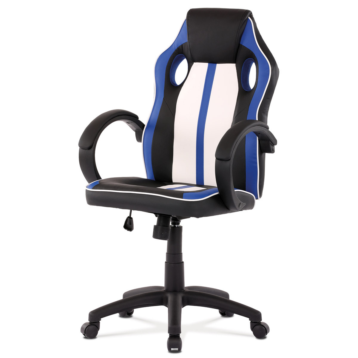 Elegantné a výrazné herné kreslo s dizajnom sedadla pretekárskeho auta a zaoblenými líniami v modrom štýle. Čalúnenie je kombináciou modrej, bielej a čiernej ekokože, ktorá kopíruje línie stoličky. Výplň je vyrobená z vysoko kvalitnej PU peny. Stolička je vybavená hojdacím mechanizmom s nastavením protiváhy a aretáciou v základnej polohe. Tuhosť protiváhy možno nastaviť veľkou plastovou skrutkou umiestnenou pod sedadlom. Výška sedenia sa nastavuje pomocou páčky na pravej strane prostredníctvom kvalitného plynového piestu. Ruky unavené z hrania si môžete pohodlne oprieť o plastové podrúčky na čiernej čalúnenej ploche na spanie z ekokože. Šírka podrúčok je 6 cm, ložná plocha 33 cm a výška 1 cm. Operadlo je vyššie s integrovanou statickou opierkou hlavy. Dizajnové otvory v hornej časti sú z praktických dôvodov potiahnuté modrou látkou MESH a nielenže dodávajú stoličke potrebný pretekársky vzhľad (otvory na bezpečnostné pásy), ale uľahčujú aj manipuláciu. Kríž je z čierneho plastu s priemerom 66 cm, ktorý zaručuje dokonalú stabilitu aj pri extrémnejších a fyzicky náročnejších hrách. Kolieska sú plastové, vhodné na koberce. Nosnosť stoličky je až 120 kg. S touto stoličkou zažijete pohodlie a komfort počas herných večerov a večerov s hrami, ale aj každodennej, menej zábavnej, kancelárskej práce.