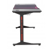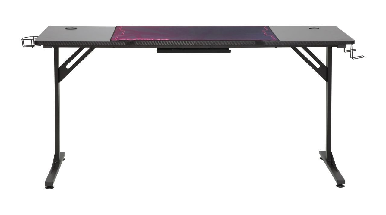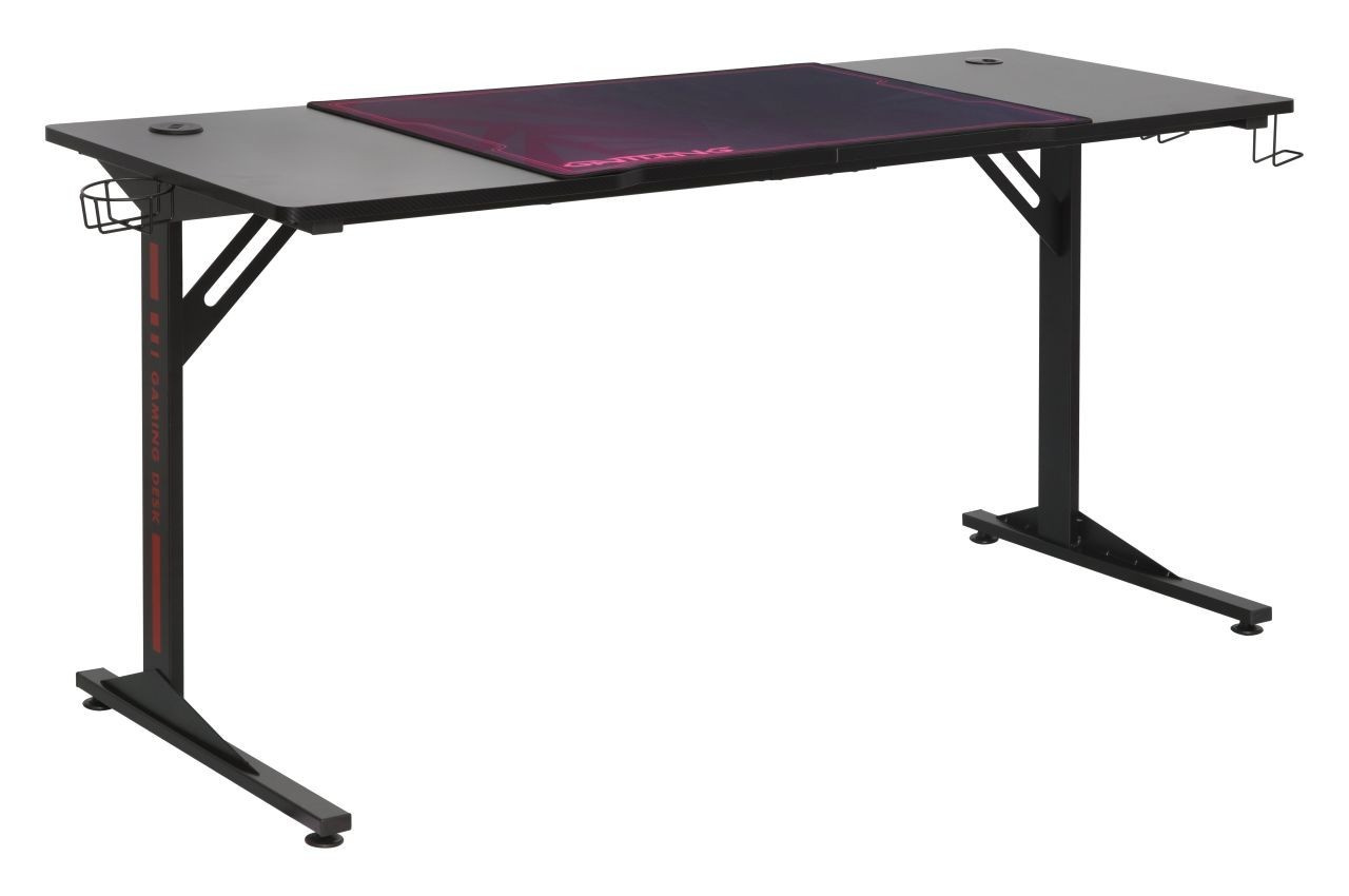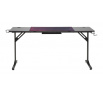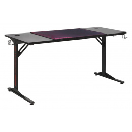 ROZMERY: - hĺbka: 60 cm - šírka: 160 cm - výška: 76 cm MATERIÁL: - doska: laminovaná doska pokrytá uhlíkovým vláknom - rám: kov lakovaný práškovou farbou FARBA: - čierna s červenými a fialovými vložkami OSTATNÉ: - kovový držiak na hrnček - kovové háčiky (napr. na slúchadlá) - USB HUB - vstup na káble