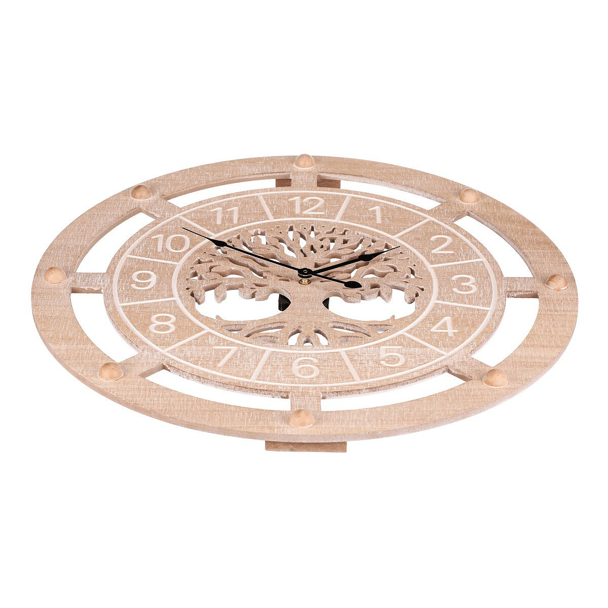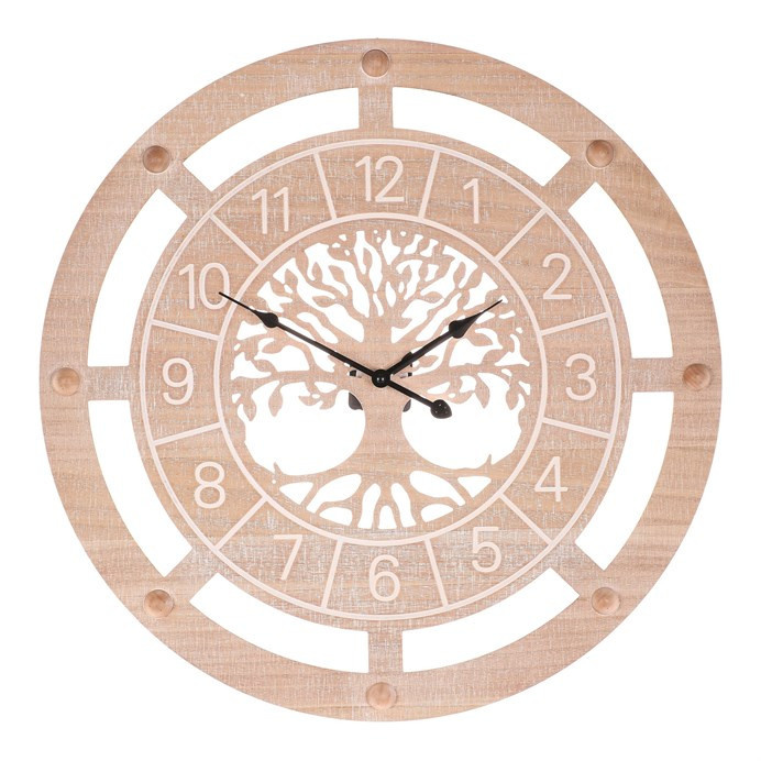 Tyto kruhové nástěnné hodiny s průměrem 60 cm kombinují elegantní design s praktickým využitím. Uprostřed ciferníku je umístěn symbolický strom života, kolem nějž jsou rozmístěny arabské číslice. Celkový tvar hodin připomíná dřevěné kormidlo, což jim dodává osobité kouzlo. Vyrobené jsou z MDF desky v hnědé barvě s černými ručičkami. Tyto hodiny přinášejí do vašeho prostoru unikátní kombinaci přírodního vzhledu a netradičního designu.