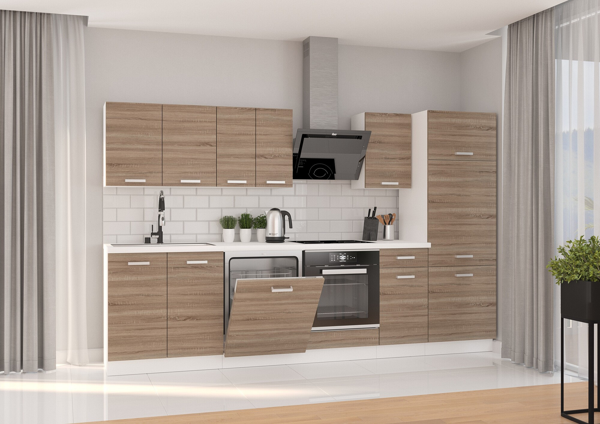 Kuchyňa je navrhnutá v atraktívnom farebnom prevedení, ktoré kombinuje bielu farbu s dekorom Dub Sonoma Trufla. Tento kontrast vytvára moderný a svieži vzhľad, ktorý sa hodí do akéhokoľvek interiéru. Biely korpus skrinky je vyrobený z laminovanej dosky o hrúbke 16 mm, čo zaisťuje jej pevnosť a odolnosť. Dvierka a čelá zásuviek sú z kvalitnej laminovanej dosky v farbe Dub Sonoma Trufla, čo dodáva skrinke prírodný a teplý vzhľad.