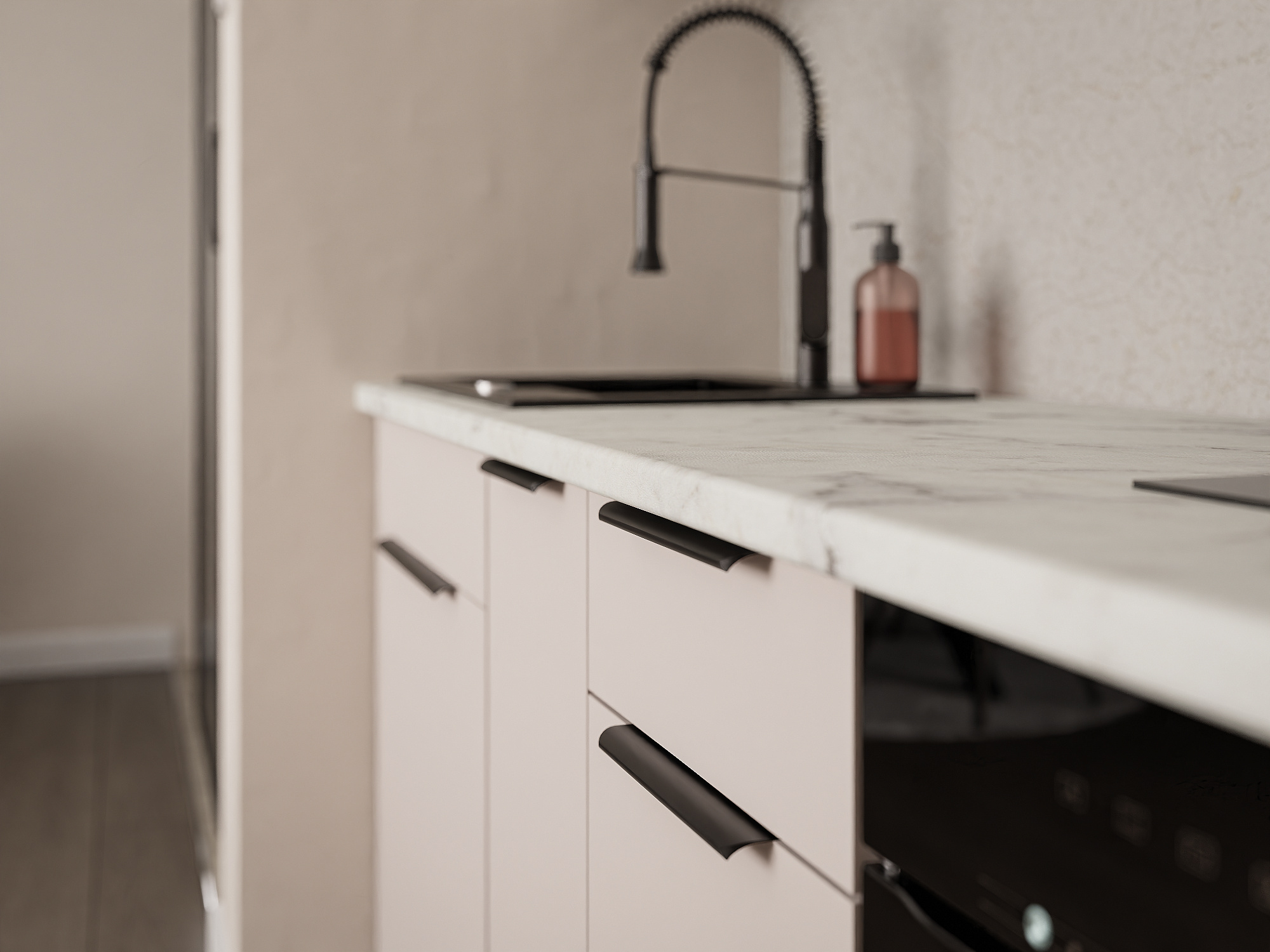 Dvierka a čelá zásuviek sú vyrobené z laminátových dosiek vysokej kvality o hrúbke 16 mm v elegantnej farbe kašmír. Sú opatrené ABS hranami, ktoré zvyšujú ich odolnosť a prispievajú k celkovému luxusnému vzhľadu.