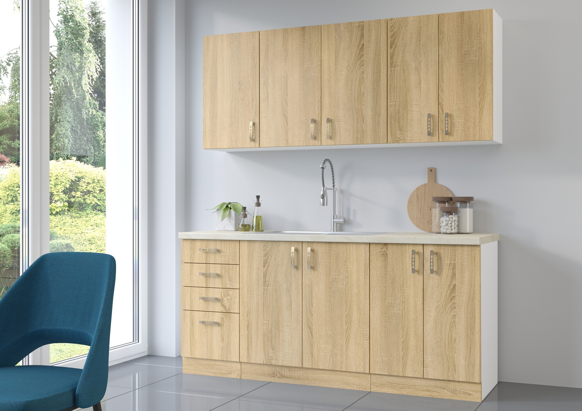 - Dvierka a čelá zásuviek sú vyrobené z laminovanej dosky 16 mm v farbe Dub Sonoma