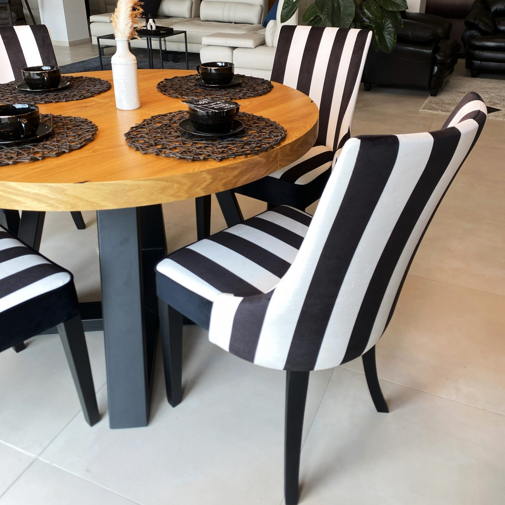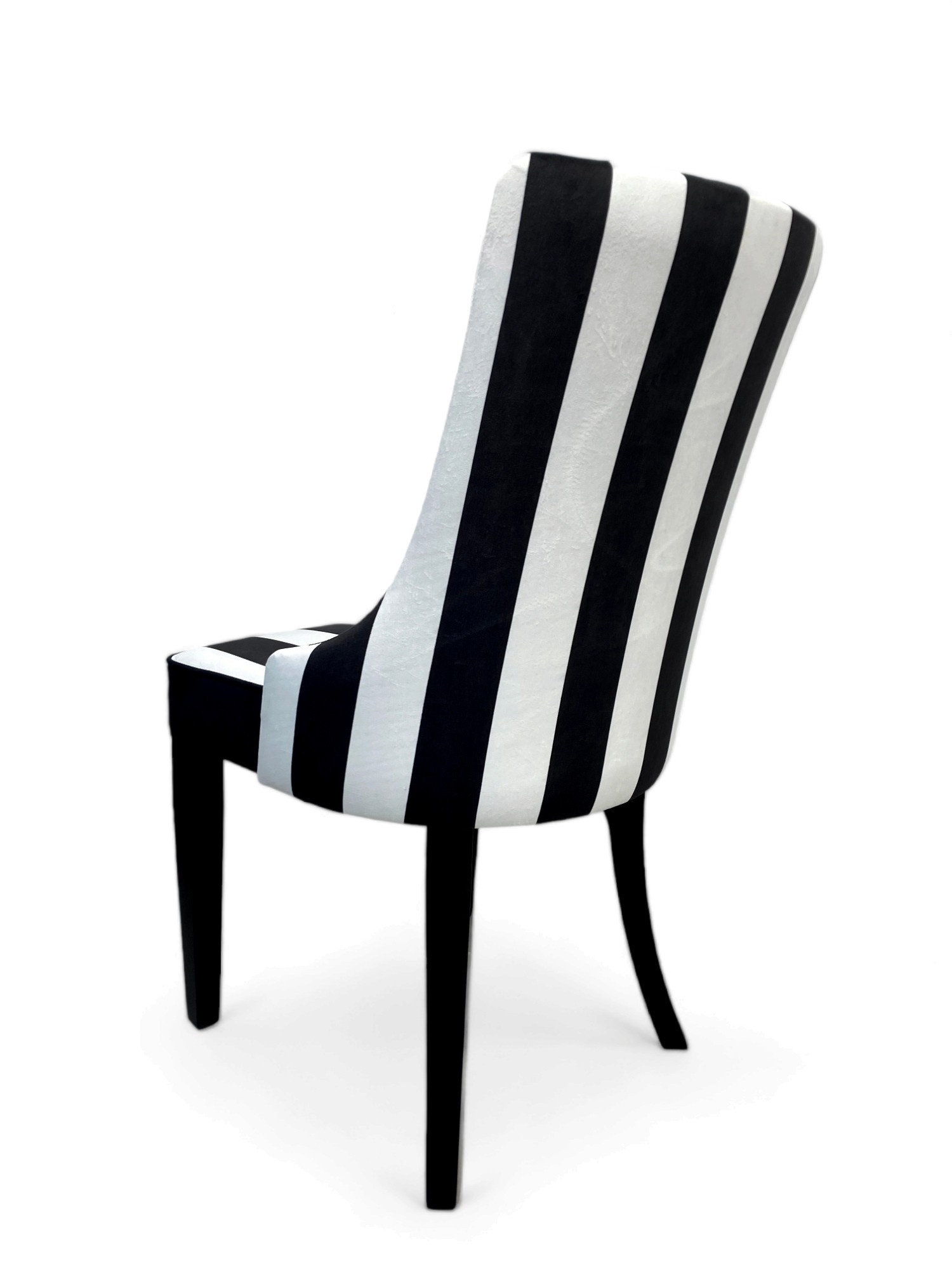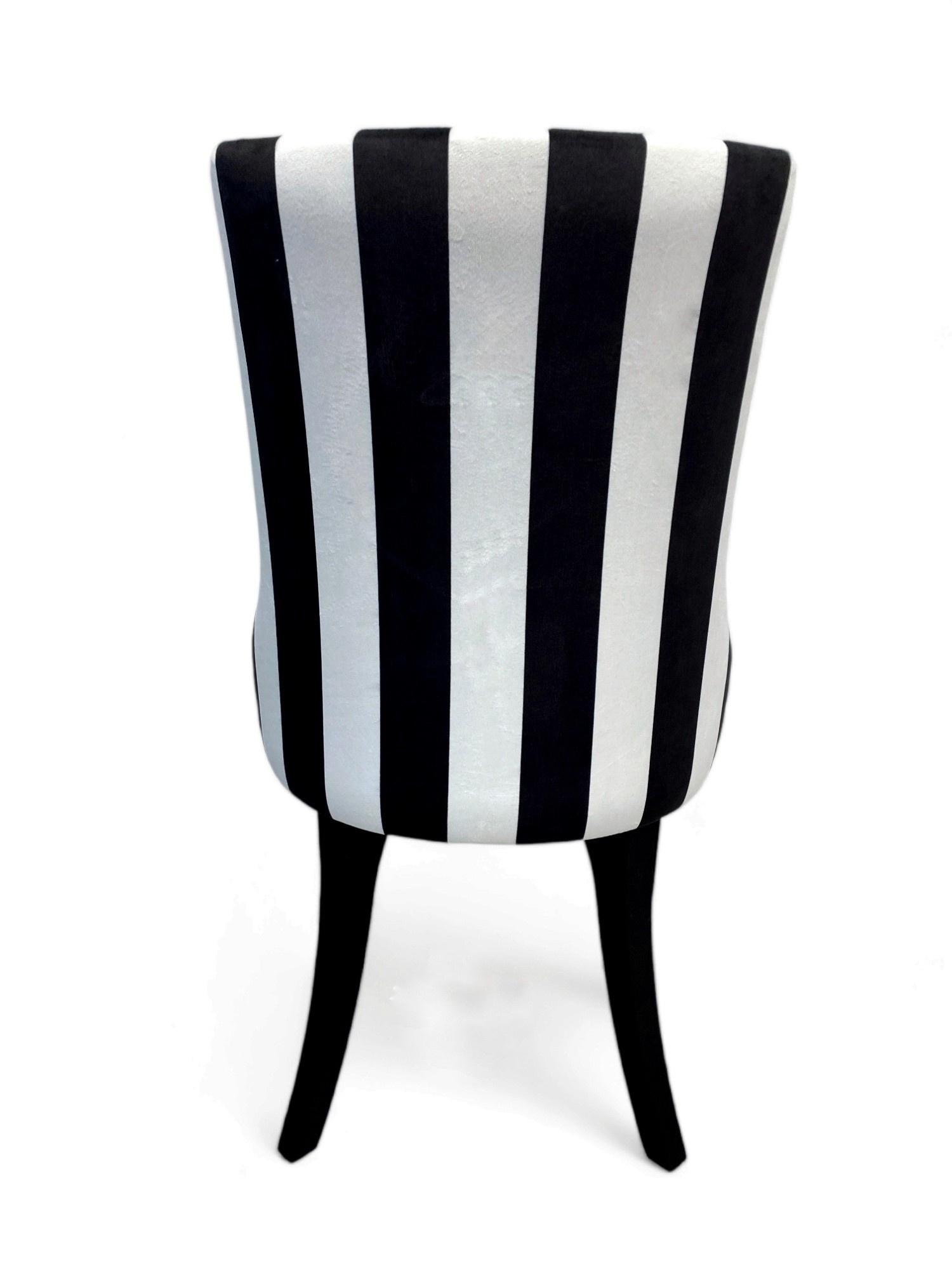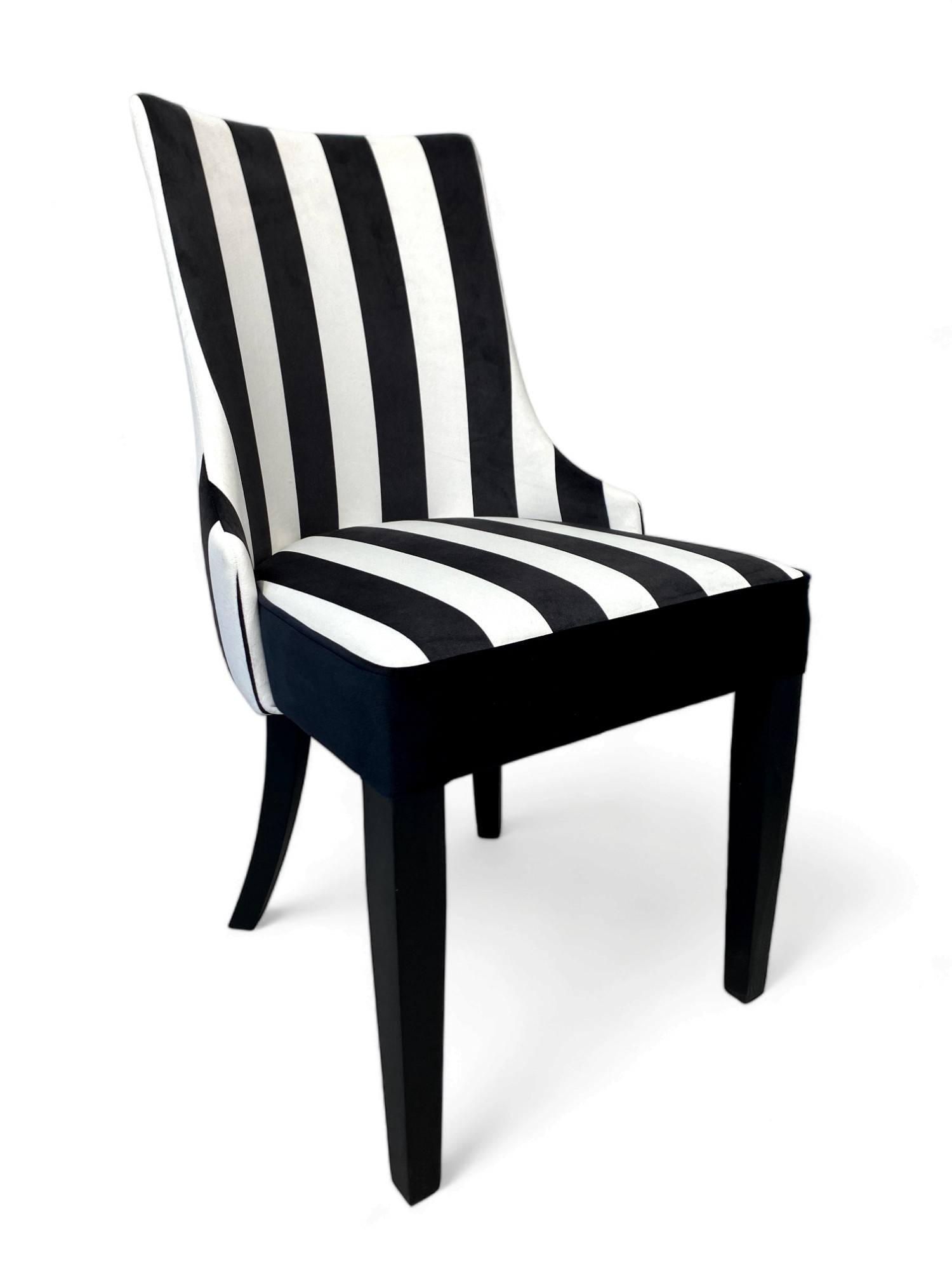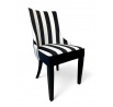 Stolička Karmen je výnimočný model pre osoby, ktoré si cenia moderný dizajn. Tkanina v čierno-biele pruhy podčiarkuje elegantný charakter stoličky. \n \nŠpecifikácia: \n \n– Vysoko pružná HR pena, \n– Drevené nohy. \n \nUvedená cena sa vzťahuje na 1 ks. stolička. Dostupných 6 kusov.