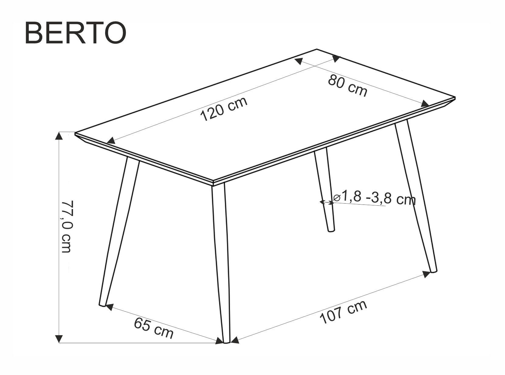 S rozmermi 120 cm na dĺžku, 80 cm na šírku a maximálnou výškou 77 cm je jedálenský stôl BERTO ideálnou voľbou pre menšie aj stredne veľké priestory. Jeho kompaktná veľkosť umožňuje jednoduché umiestnenie v rôznych typoch interiérov, bez toho aby zaberal príliš veľa miesta. Napriek tomu poskytuje dostatok priestoru pre pohodlné stolovanie až štyroch osôb.