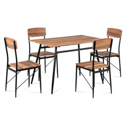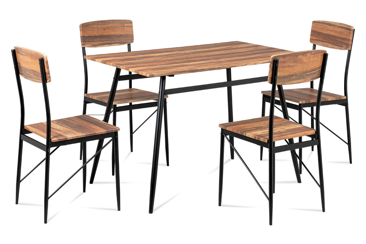 Jedálenský set v industriálnom štýle pozostáva zo štyroch jedálenských stoličiek a jedného jedálenského stola. Doska stola je vyrobená z 1,5 cm vysokej MDF dosky v prevedení vintage čerešňa s povrchovou úpravou driftwood, ktorá dokonale imituje povrch masívneho dreva, a je pripevnená k modernej kovovej podnoži, ktorá je natretá matnou čiernou farbou a obsahuje čierne plastové klzáky, ktoré znižujú riziko poškodenia podlahy. Štyri jedálenské stoličky majú sedadlo a operadlo vyrobené z MDF vo farbe vintage cherry s povrchovou úpravou driftwood. Podstavce stoličiek sú vyrobené z kovu a natreté matnou čiernou farbou. Súčasťou podstavcov sú aj čierne plastové klzáky, ktoré znižujú riziko poškodenia podlahy. Nosnosť jednej stoličky je až 90 kg.
