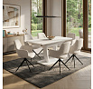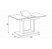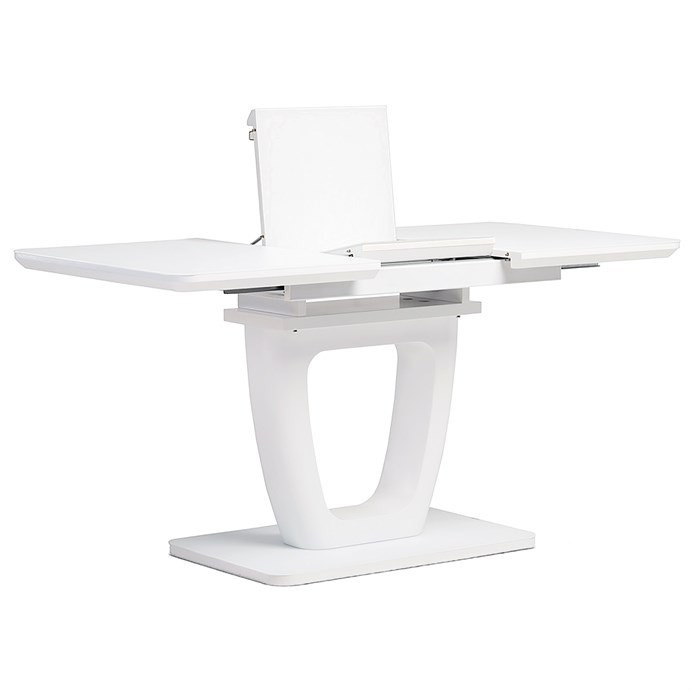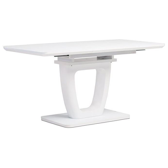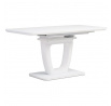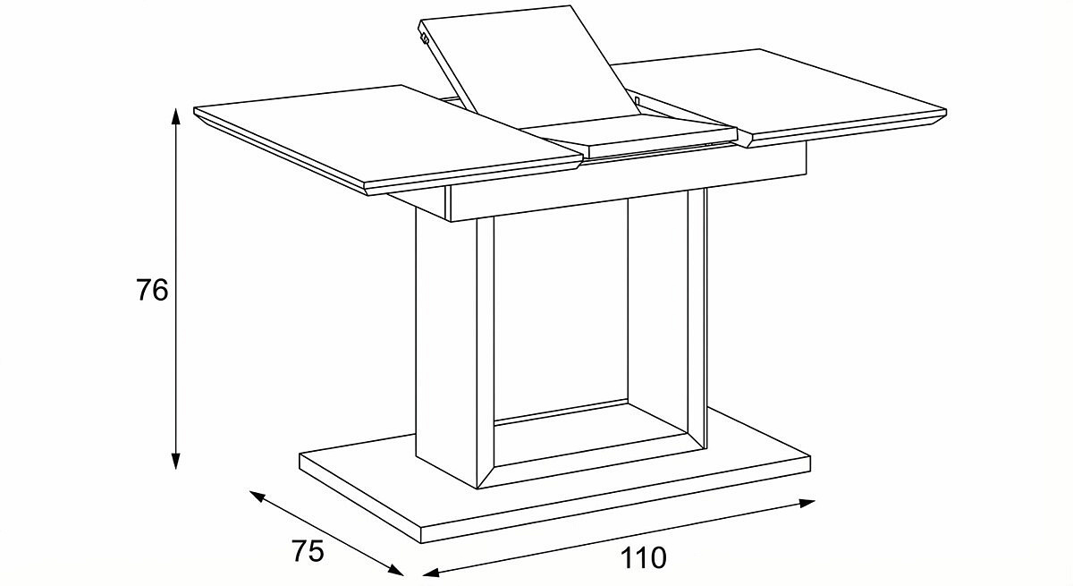 Dizajnový jedálenský stôl s rozmermi 110 + 40 x 75 cm. Vrchná doska stola je z tvrdeného skla s hrúbkou. 4 mm v bielej farbe. Odkladacia časť je tiež pokrytá bielym sklom ako celá doska stola, čo nie je štandardné a zaraďuje stôl do vyššej kategórie. Základná doska, centrálna noha, je vyrobená z MDF a má čisto bielu matnú povrchovú úpravu. Plošina je tiež vyrobená z MDF a pokrytá farebným sklom. Vybavený plastovými klzákmi na spodnej časti, aby sa minimalizovalo poškodenie tvrdých podlahových povrchov. Mechanické komponenty sú kovové. Stôl určite zaujme svojím nadčasovým dizajnom a dokonalým spracovaním detailov a v neposlednom rade aj farbou a stane sa elegantným prvkom v moderných a klasicky zariadených jedálňach, kuchyniach a obývacích izbách. Výška stola je 76 cm. Na stôl sa zmestí až 6 stoličiek.