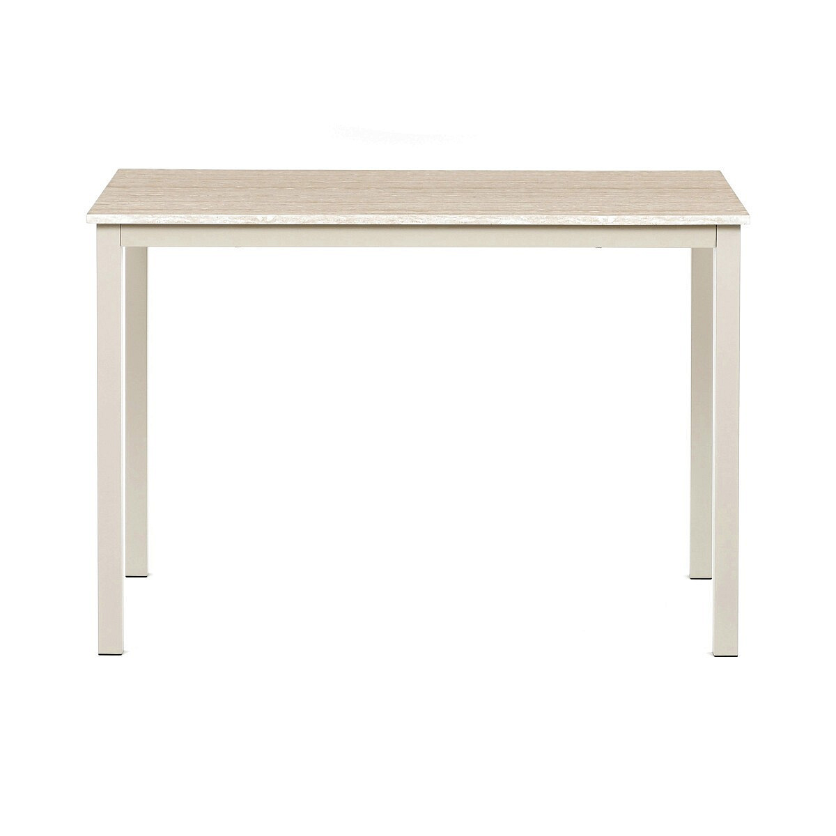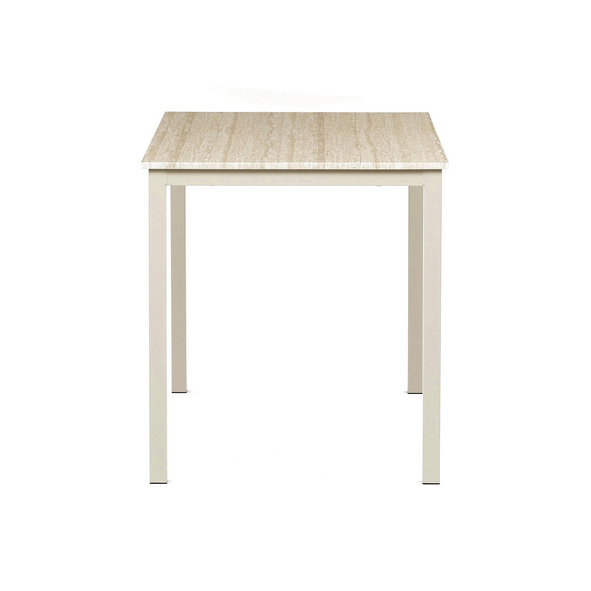 Jídelní stůl o rozměrech 110 × 70 × 75 cm kombinuje desku z MDF s dekorativním povrchem v odstínu travertinu a stabilní kovovou podnož v lakovaném cashmere provedení. Deska je opatřena matnou povrchovou úpravou, která usnadňuje údržbu a odolává běžnému opotřebení. Kovová podnož zajišťuje pevnost a stabilitu celé konstrukce, což přispívá k dlouhé životnosti stolu. Design s čistými liniemi a přírodními odstíny travertinu vytváří univerzální řešení vhodné do moderních i klasických interiérů. Stůl není rozkládací a nabízí pevnou pracovní nebo jídelní plochu s nosností odpovídající běžnému domácímu použití.