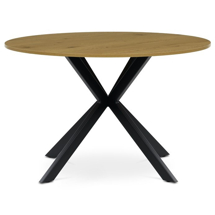 Jídelní kulatý stůl HT-F4120 OAK značky Autronic vyniká kombinací přírodního dekoru divokého dubu a robustní konstrukce s černými kovovými nohami. Deska stolu je vyrobena z MDF materiálu s tloušťkou optimalizovanou pro odolnost a stabilitu, opatřená ABS hranou, která chrání okraje před poškozením a zajišťuje dlouhou životnost. Kovová podnož je tvořena čtyřmi širokými nohami uspořádanými do kříže, což zajišťuje vysokou pevnost a stabilitu celé konstrukce, přičemž povrch nohou je upraven práškovým lakem pro zvýšení odolnosti proti korozi a mechanickému opotřebení. Praktickou vlastností jsou rektifikační nohy umožňující vyrovnání stolu na nerovném povrchu, což zvyšuje komfort používání a zabraňuje kývání. Kulatý tvar desky podporuje rovnoměrné rozložení prostoru pro sezení a usnadňuje komunikaci mezi uživateli, což ocení zejména v jídelních prostorách. Stůl je vhodný pro domácnosti i komerční provozy, kde je kladen důraz na kombinaci estetického vzhledu a funkčnosti. Rozměry 120 cm v průměru a výška 75 cm poskytují dostatek prostoru pro pohodlné stolování, přičemž nosnost konstrukce odpovídá běžným požadavkům na jídelní nábytek.