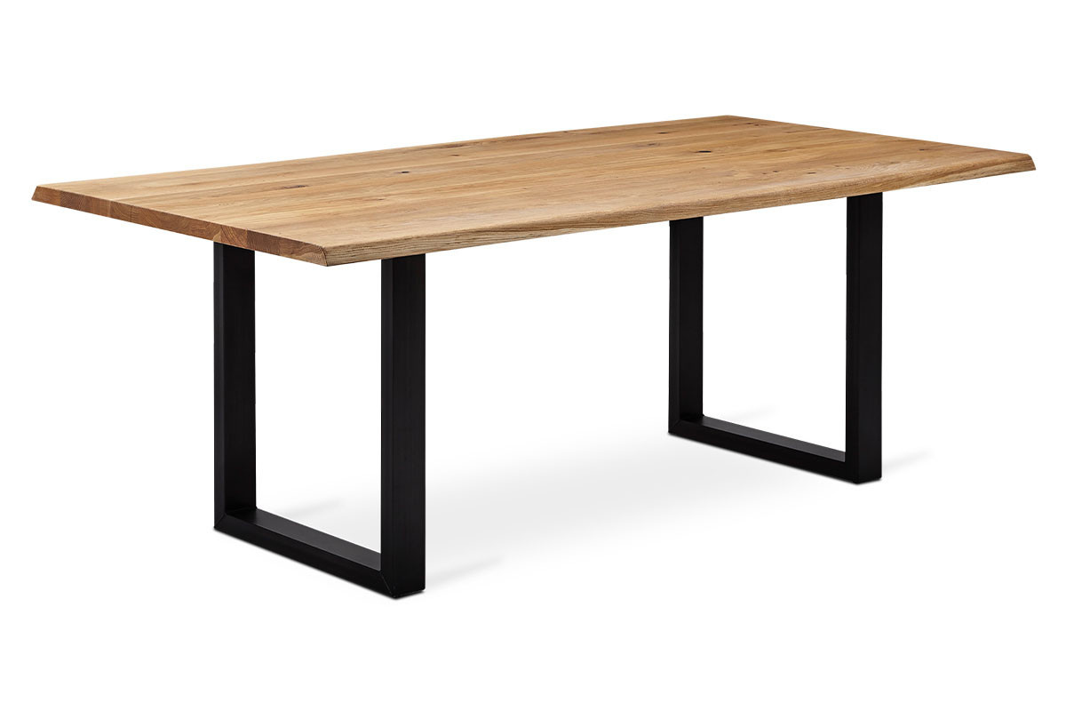 Prírodný jedálenský stôl s rozmermi 180x91 cm vyrobený z masívneho dubového dreva v kombinácii s čiernymi kovovými nohami v tvare U zaujme svojím rustikálnym štýlom a spracovaním. Je vyrobená v minimalistickom severskom dizajne, ktorý kontrastuje so svetlejším prírodným odtieňom vrchnej dosky a čiernym lakom. Dokonale sa hodí a bude veľmi elegantným prvkom nielen v industriálnych, ale aj v moderných a klasických jedálňach, kuchyniach a obývacích izbách. Čisté línie a kvalitné spracovanie masívneho dreva vytvárajú očarujúce akcenty a podčiarkujú útulnú atmosféru v interiéri. Tento jedálenský stôl vás pozýva nielen k odpočinku, ale aj k stretnutiam s rodinou a priateľmi v slávnostných i každodenných chvíľach. Doska stola je vyrobená z kvalitne spracovaného súvislého dubového kĺbu s hrúbkou 4 cm. Dlhšie strany tváre sú nepravidelne skosené pod uhlom takmer 45°, čo zdôrazňuje jej prirodzený štýl. Robustné kovové nohy sú práškovo lakované kvalitnou matnou čiernou farbou a majú obdĺžnikový prierez 8 x 4 cm. V spodnej časti sú vybavené plastovými rektifikačnými klzákmi, ktoré zabraňujú poškodeniu podlahovej krytiny a zaručujú dokonalé vyváženie celého stola. Výška stola je 75 cm. Vzdialenosť medzi nohami je 114 cm na dlhšej strane a 52 cm na kratšej strane. Vzdialenosť od pracovnej dosky je 71 cm. Spodná časť dosky je na troch miestach vystužená kovovými L profilmi, ktoré zabraňujú nežiaducemu krúteniu. Povrchová úprava je transparentný olej. Na stôl sa zmestí až 8 stoličiek.