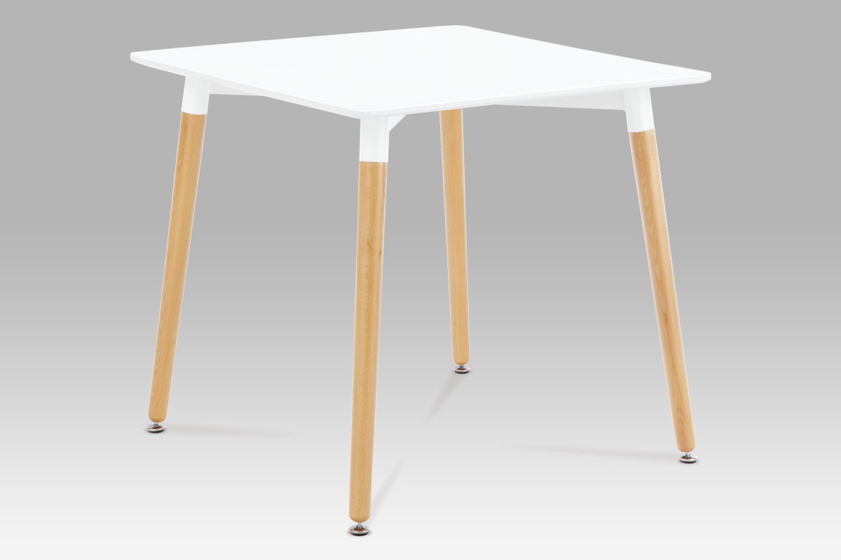 Moderný dizajnový jedálenský stôl 80x80 cm. Nohy sú vyrobené z masívneho bukového dreva v prírodnej farbe a zakončené rektifikačnými skrutkami. Biela stolová doska s hrúbkou 2 cm. Stôl je vhodný do kuchyne, jedálne. K tomuto stolu odporúčame vybrať stoličky s podnožou z masívneho dreva.